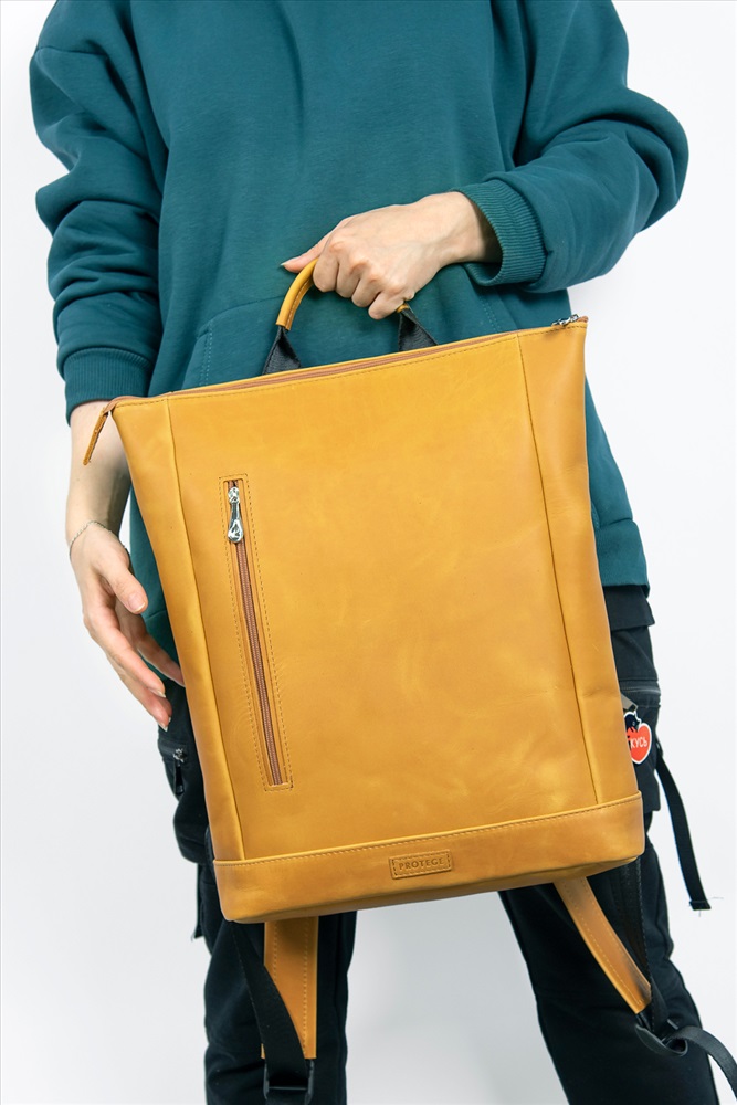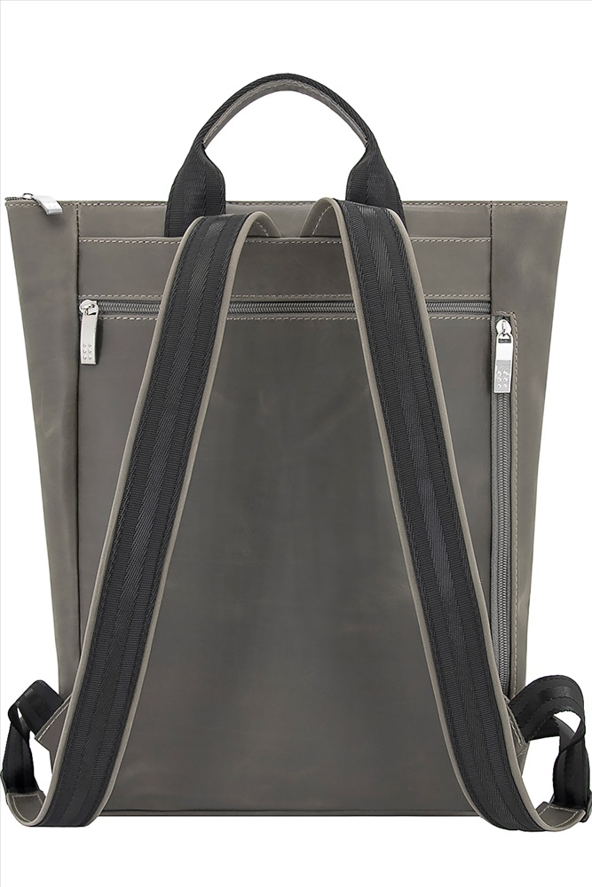 Рюкзак унисекс большого размера прямоугольной формы. При желании вмещает формат А4. Сумка имеет одно отделение и застегивается на молнию. На передней стенке есть карман на молнии .На задней стенке также расположен карман на молнии, ручка из стропы, укрепленная кожей и регулируемые кожаные лямки на стропе. Внутри рюкзак имеет карман на молнии и карман для мобильного телефона и визиток. Выполнен из кожи с особенным эффектом на поверхности. Привлекательный внешний вид достигается за счет изломов воскового покрытия. Благодаря этому готовые изделия и сама кожа становятся светлее в местах сгибов и частых прикосновений.