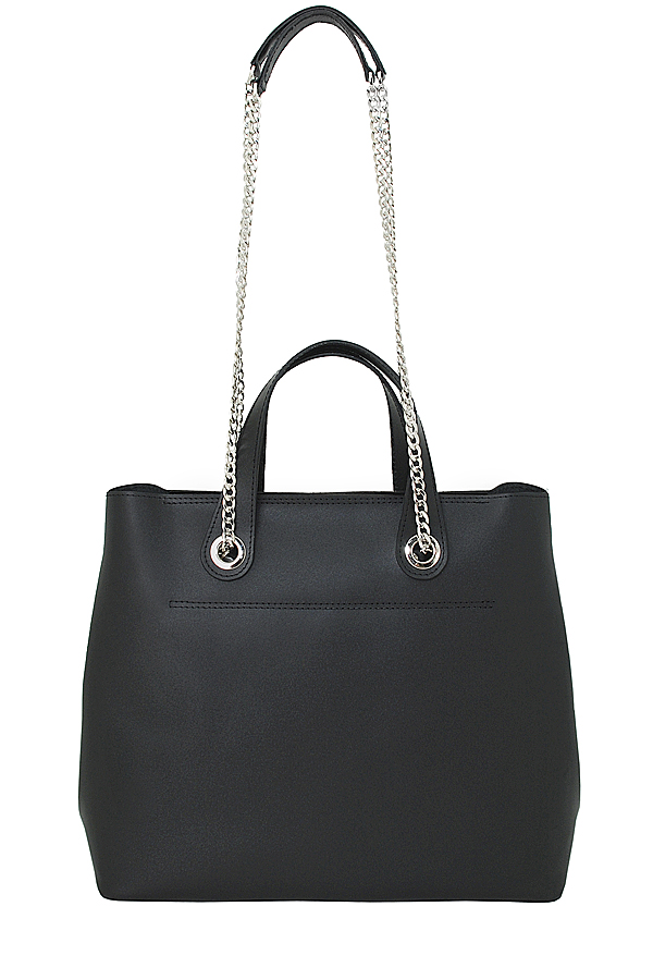 Сумка женская с короткими и удлиненными ручками на плечо. Сумка застегивается на молнию и имеет одно отделение. Объем сумки регулируется кнопками по бокам. Короткие ручки сумки имеют отделку металлическими люверсами, удлиненные ручки-цепями. При желании удлиненные ручки можно легко затянуть вовнутрь сумки. Сумка без подкладки. Корпус сумки выполнен из плотной формоустойчивой кожи. Внутри сумки расположены два кармана на молнии из плотного материала.