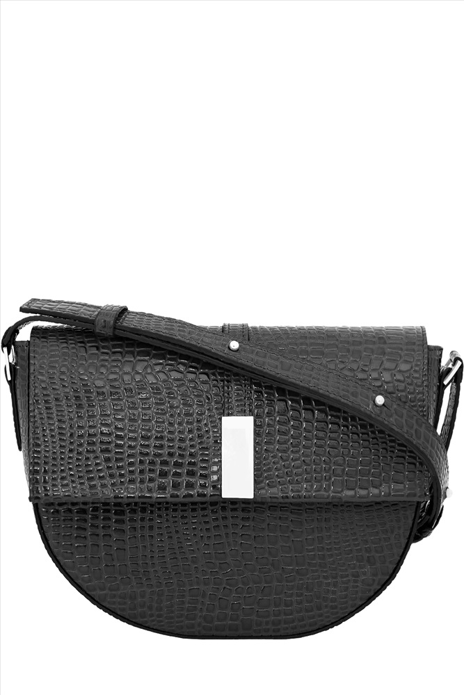 Сумка женская полукруглая с несъемным регулируемым ремнем через плечо. Сумка застегивается на клапан с магнитом и имеет одно отделение. Клапан сумки декорирован накладкой из кожи и металлической фурнитурой. На задней стенке расположен накладной карман. Сумка на подкладке. Внутри сумки расположен карман на молнии и накладной карман для телефона и визиток.