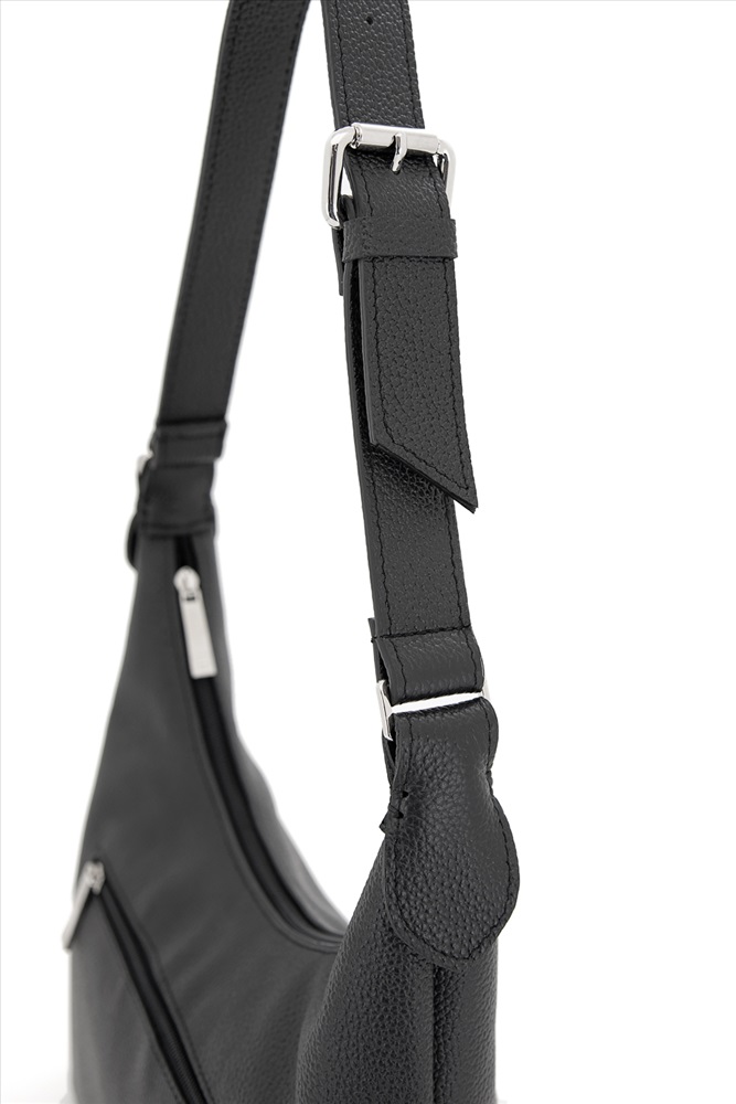 Цвет: черный Натуральная кожа: флотер Подкладка: 100% п/э Ремень плечевой: 51-42 см Параметры: 30х33х10см Сумка мягкой формы с несъемным регулируемым ремнем, застегивается на молнию и имеет одно отделение. Сумка выполнена с использованием операций ручной работы. На передней стенке декоративный шильдик, на задней стенке расположен карман на молнии. Сумка на подкладке, внутри карман на молнии и накладной карман на молнии "карман в кармане". Комментарии к товару