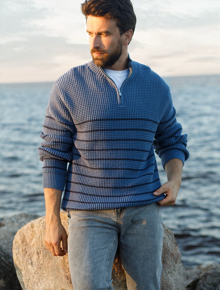 Параметры модели на первом фото: Рост 190, бюст 108, талия 87, бедра 104 Свитер с узором полосы выполнен из хлопковой пряжи с добавлением акрила. Теплая модель фактурной крупной вязки с воротом, застегивается металлической молнией. Регулируя ворот можно носить с рубашками, футболками и водолазками. Кроме того, свитер совершенно не колется, поэтому его комфортно носить даже на голое тело. Внизу изделия нашивка бренда из эко-кожи. Комментарии к товару
