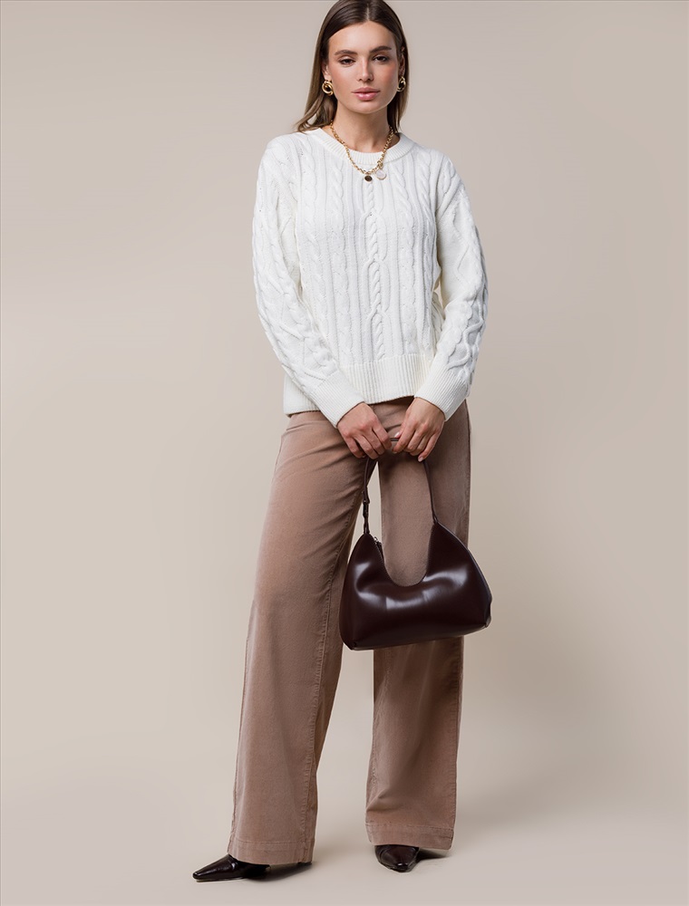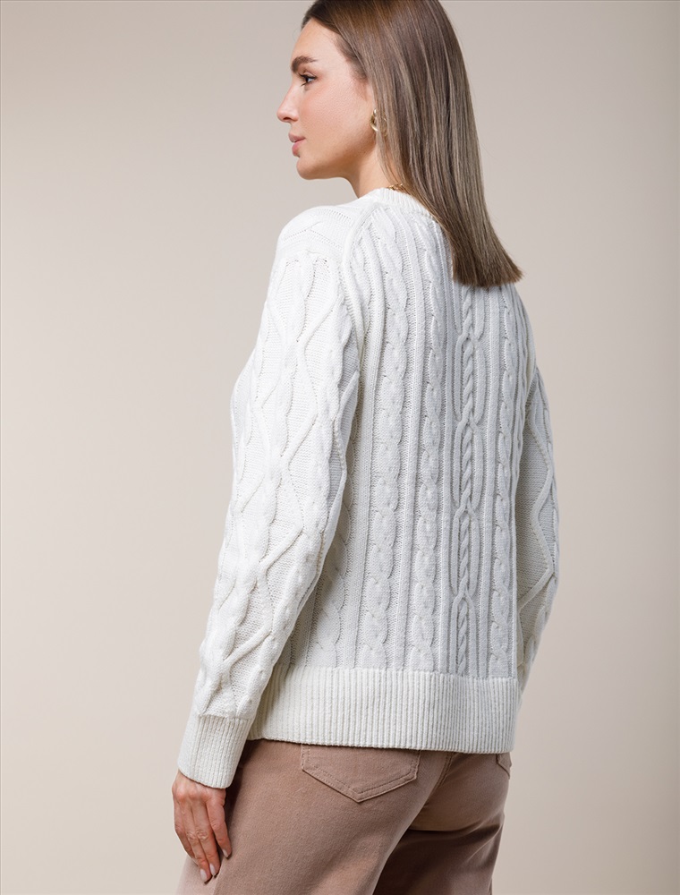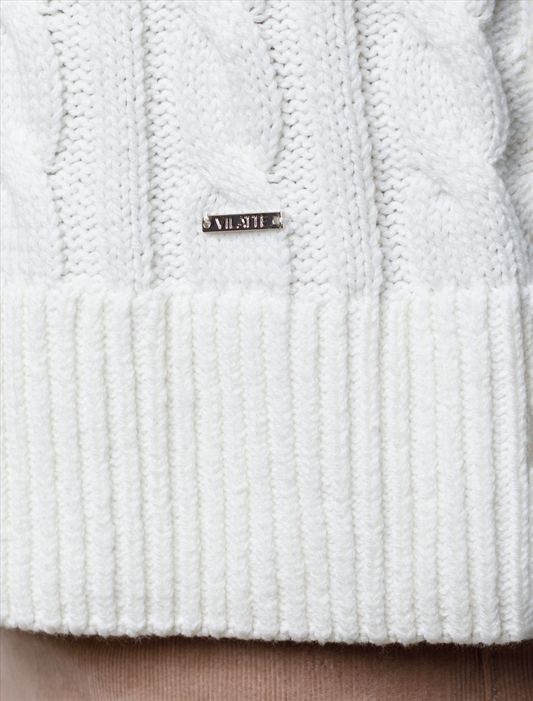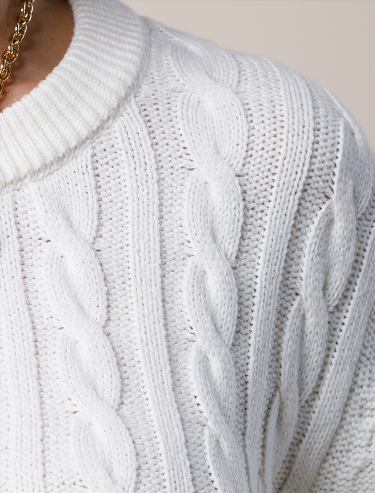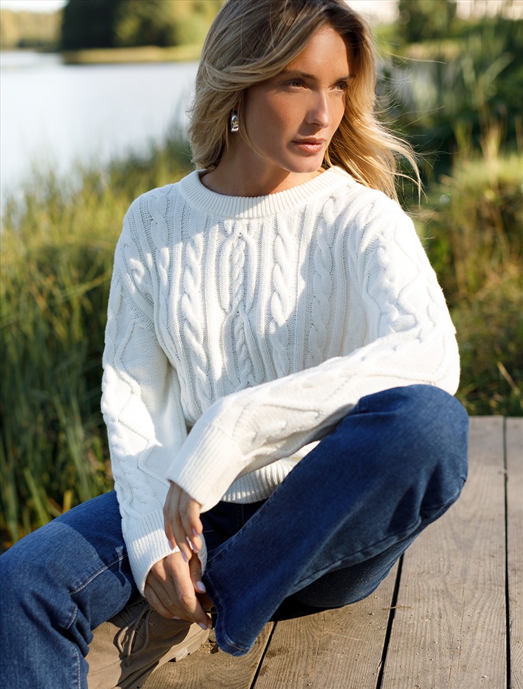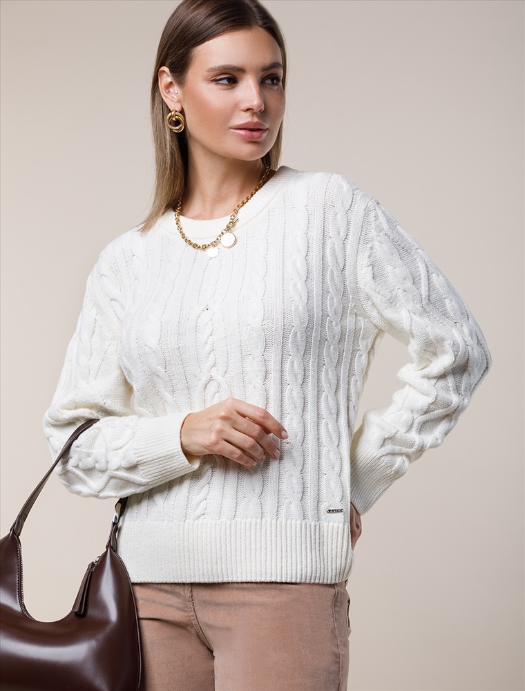 Свитер выполнен из мягкой хлопковой пряжи фактурной вязки с добавлением акрила. Модель связана изнаночной петлей, в сочетании с которой узор косы и высокие рибаны поддерживают ирландский стиль, который всегда в тренде. Круглый вырез. Свободная посадка.
