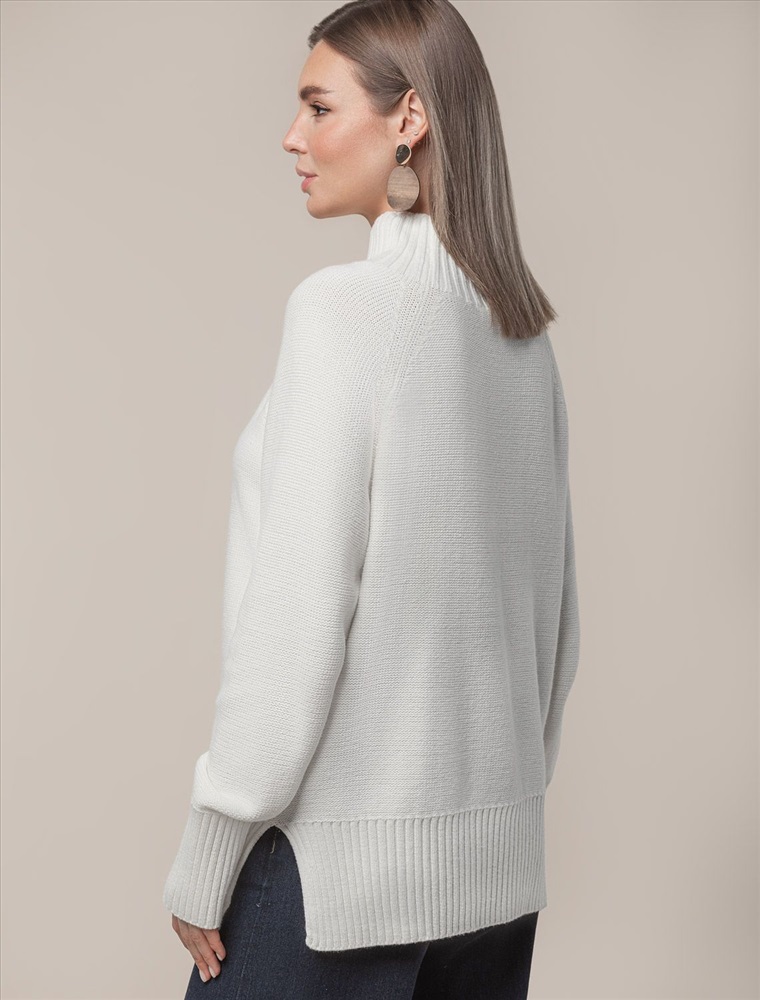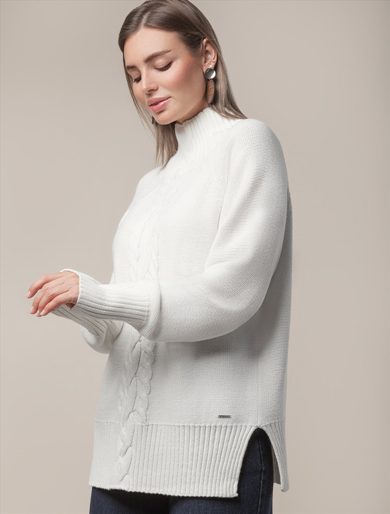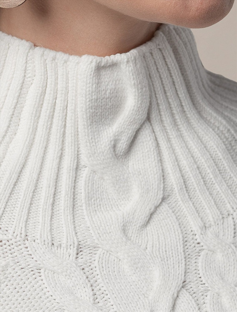 Свитер выполнен из мягкой хлопковой пряжи фактурной вязки с добавлением акрила. Модель связана изнаночной петлей, в сочетании с которой узор косы и высокие рибаны поддерживают ирландский стиль, который всегда в тренде. Комфортный ворот стойка хорошо защищает от ветра. Боковые разрезы поддерживают расслабленный свободный силуэт. Изделие сочетается с любым низом и не требует дополнительных аксессуаров.