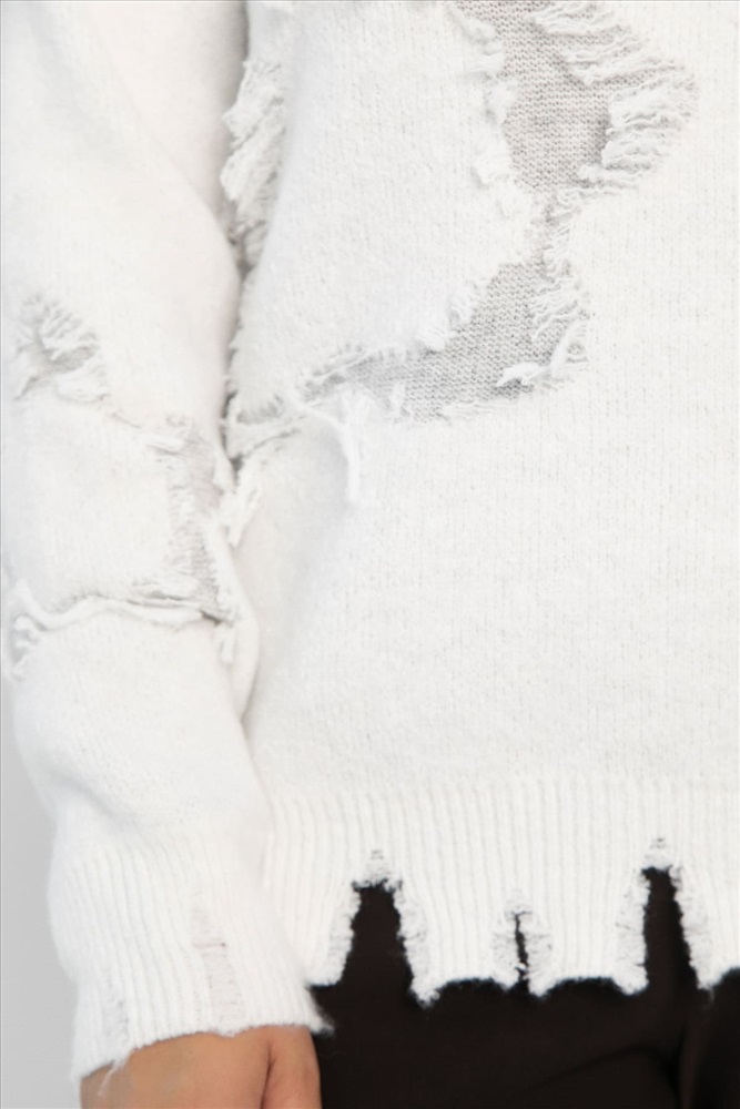 Женский рваный свитер — это яркий элемент, который станет изюминкой повседневного гардероба. Мягкий и приятный на ощупь материал обеспечивает комфорт на протяжении всего дня. Свободный крой не стесняет движений и дарит ощущение легкости и уверенности. Оригинальный рваный дизайн с изображением серого цветка придаёт изделию уникальность. Это идеальный выбор для создания стильных и комфортных образов!