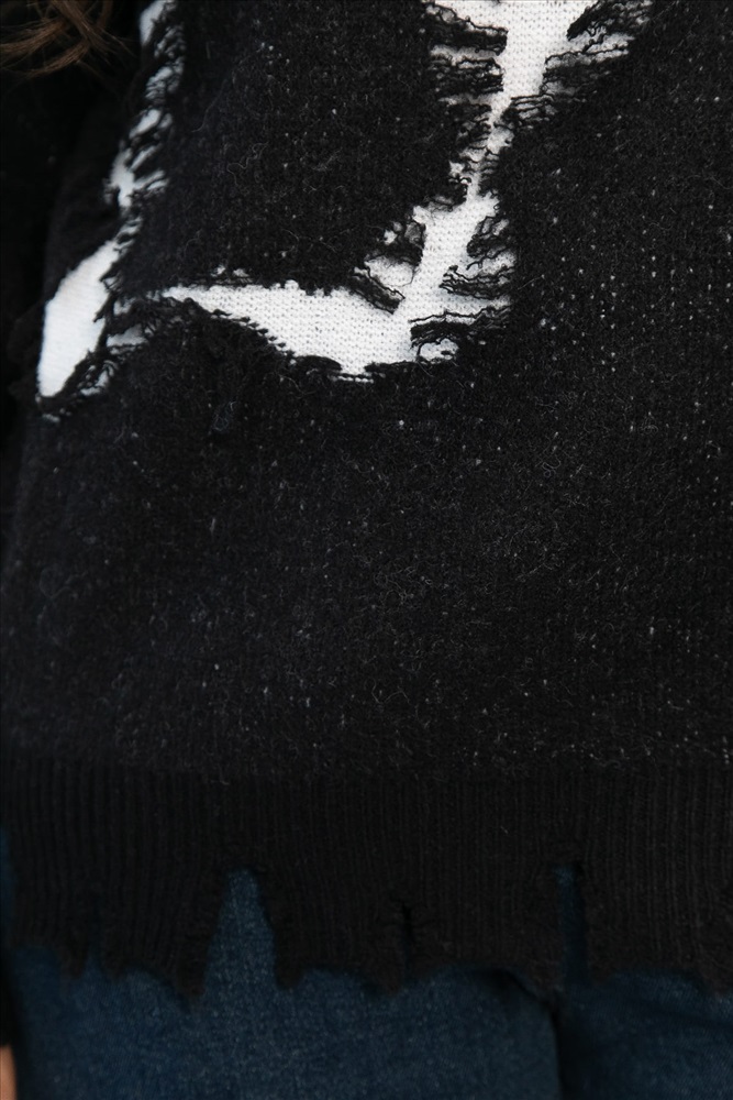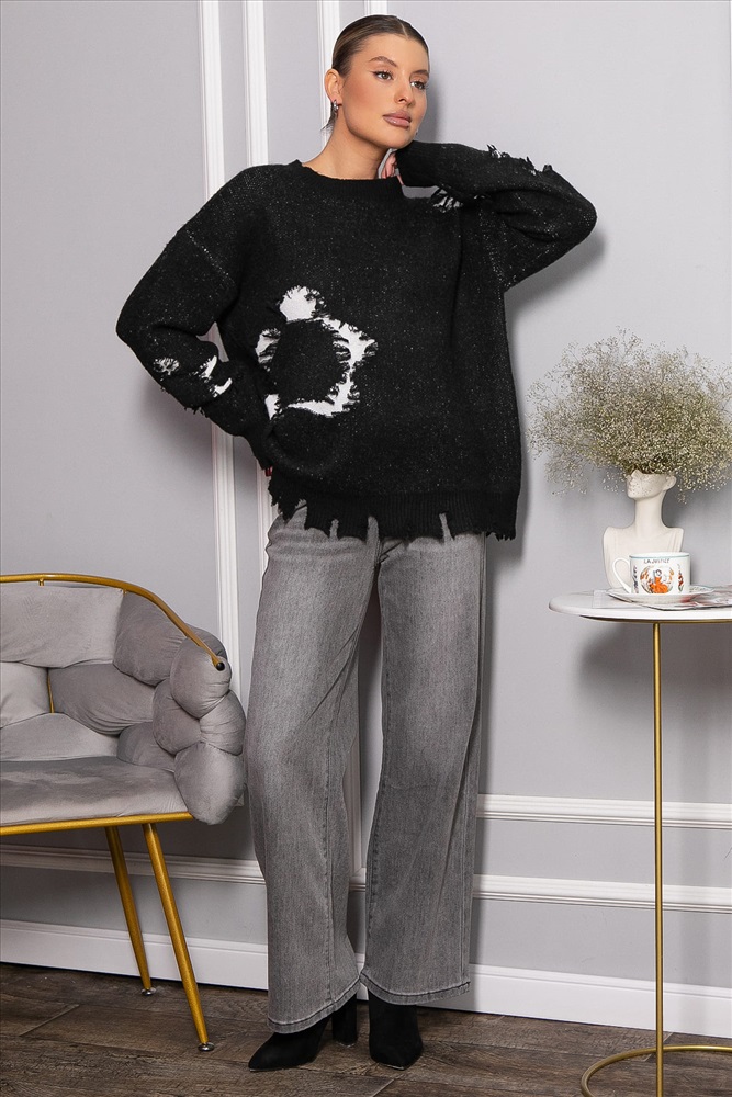 Женский рваный свитер — это яркий элемент, который станет изюминкой повседневного гардероба. Мягкий и приятный на ощупь материал обеспечивает комфорт на протяжении всего дня. Свободный крой не стесняет движений и дарит ощущение легкости и уверенности. Оригинальный рваный дизайн с изображением белого цветка придаёт изделию уникальность. Это идеальный выбор для создания стильных и комфортных образов!