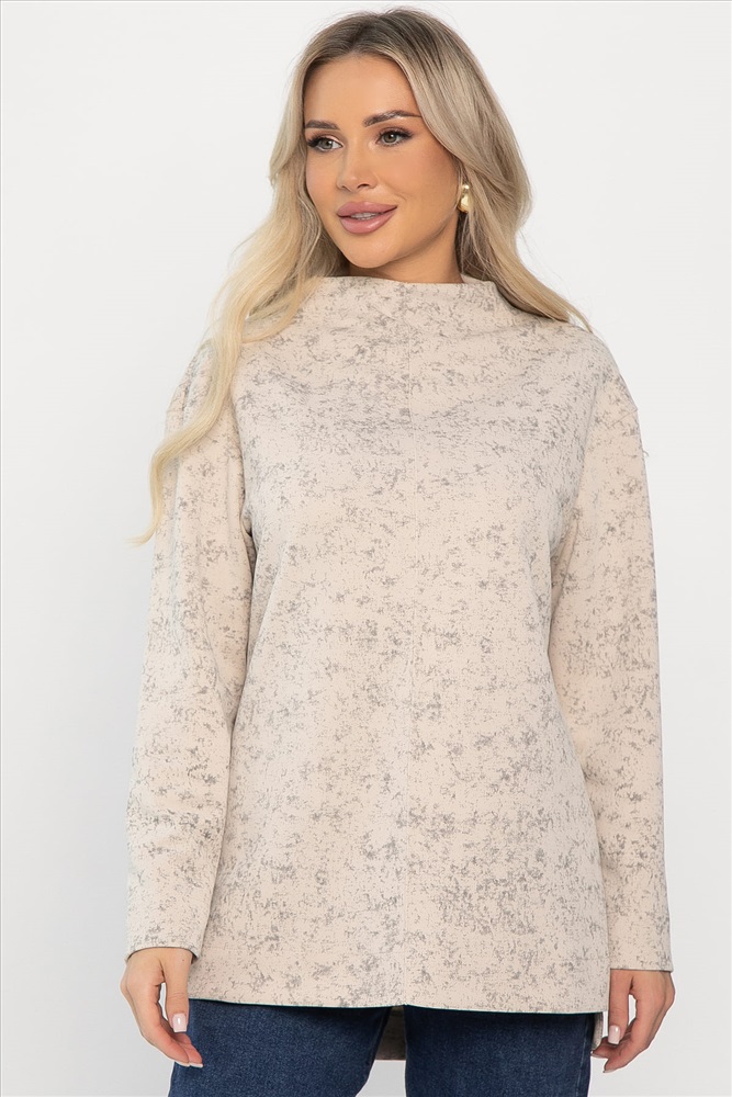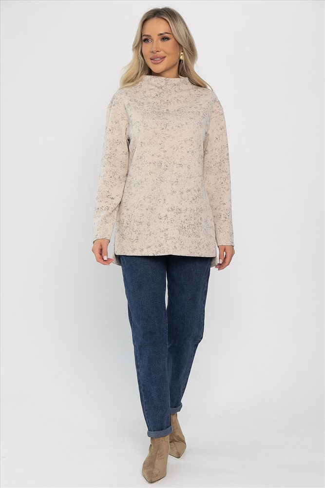 Свободный крой и спущенные рукава создают непринуждённый образ, а цельнокроеная стойка придаёт ему современный вид. Разрезы по бокам обеспечивают свободу движений и делают силуэт более интересным.