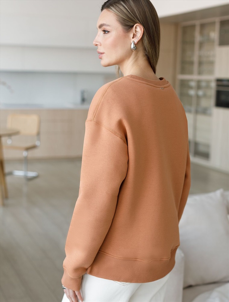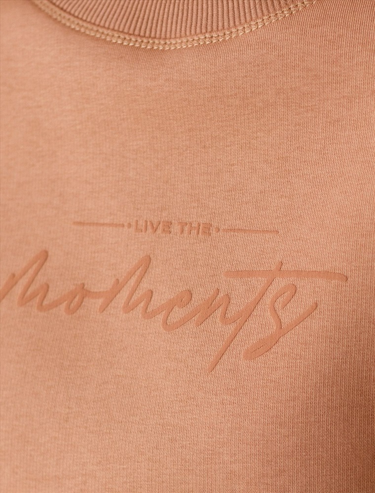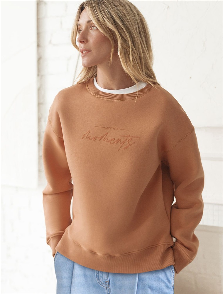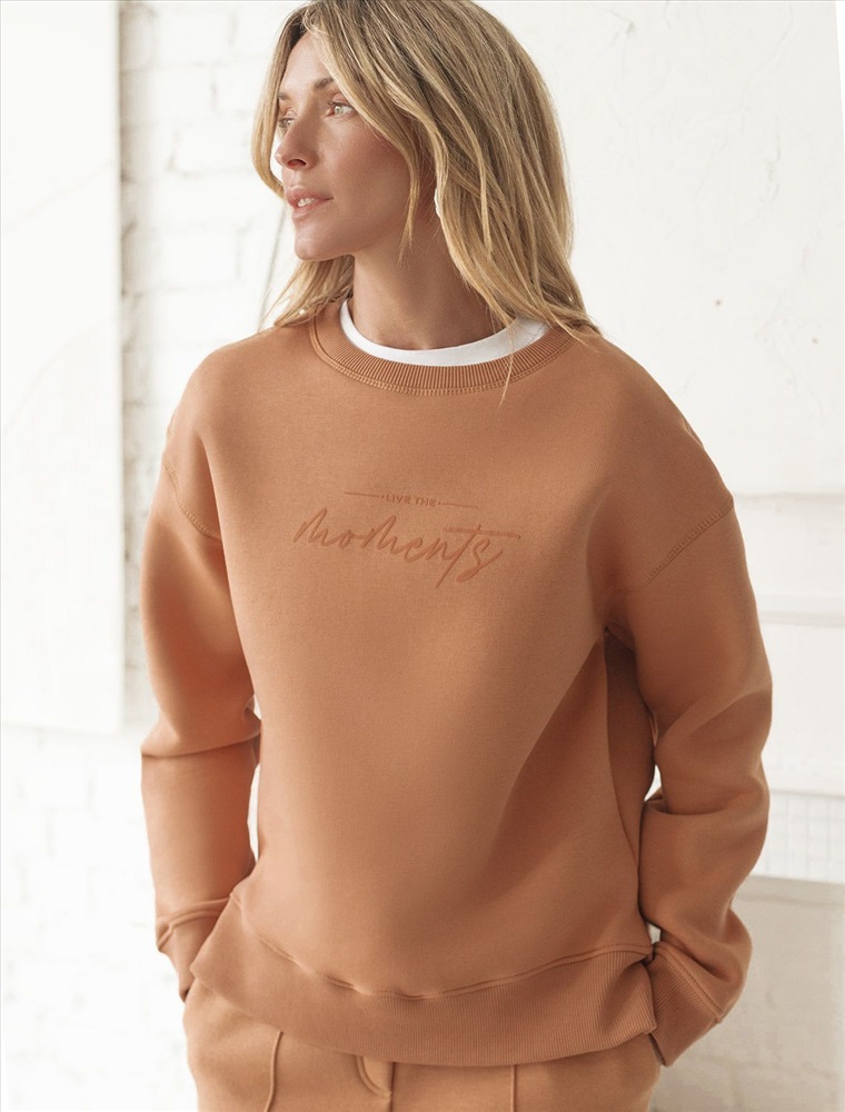 Плотность: 320 Г/м2 Параметры модели на первом фото: Рост 170, бюст 89, талия 63, бедра 92 Сочетается с артикулами: D44.133, D44.149 Свитшот с круглым воротом выполнен из премиального футера трехнитки с теплым начесом. Модель дополнена фактурным лаконичным принтом. Перевод: «Живи мгновениями». Свободный крой подходит для любой фигуры и впишется в любой гардероб. Комментарии к товару