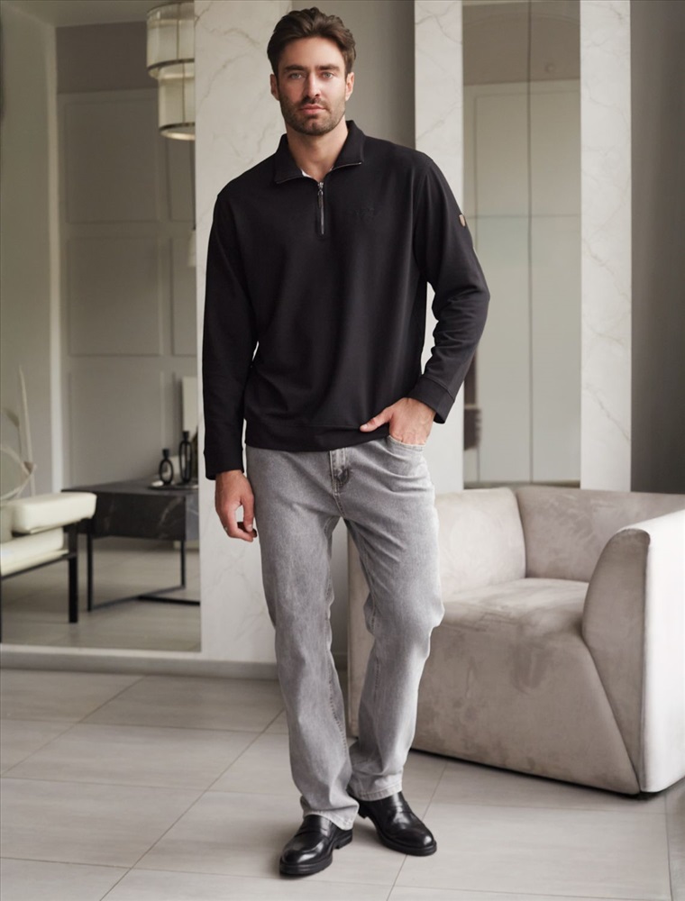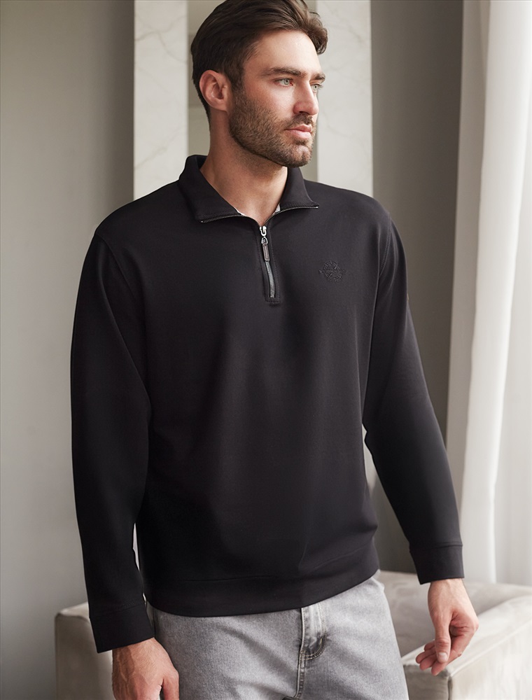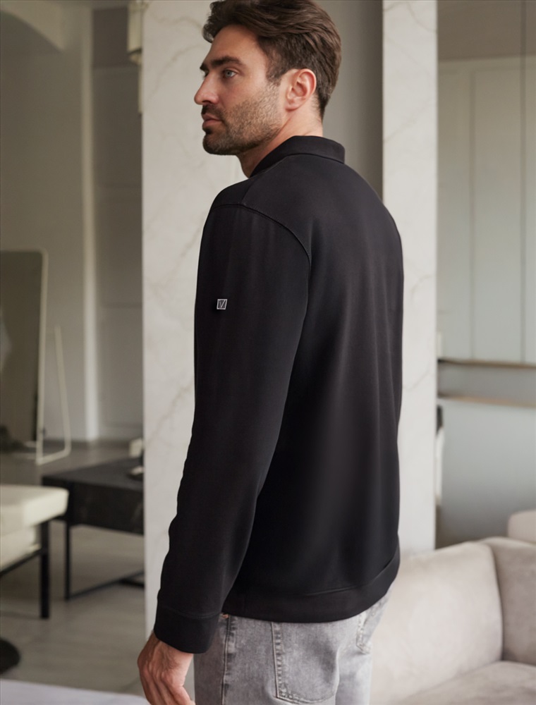 Уютный и стильный свитшот черного цвета с воротом-стойкой на молнии - идеальный выбор для повседневного образа. Выполнен из премиального футера двухнитки с эластаном, Изнаночная сторона невероятно мягкая, что делает материал особенно приятным к телу. Благодаря эластичной структуре ткань хорошо тянется, сохраняет форму после длительной носки и обеспечивает свободу движений даже в самых активных буднях, а натуральный состав обеспечивает отличную воздухопррницаемость, позволяя коже дышать и не перегреваться.