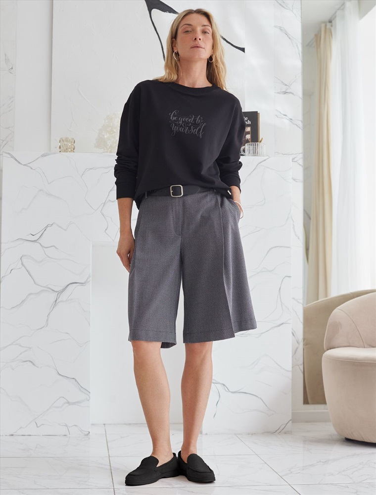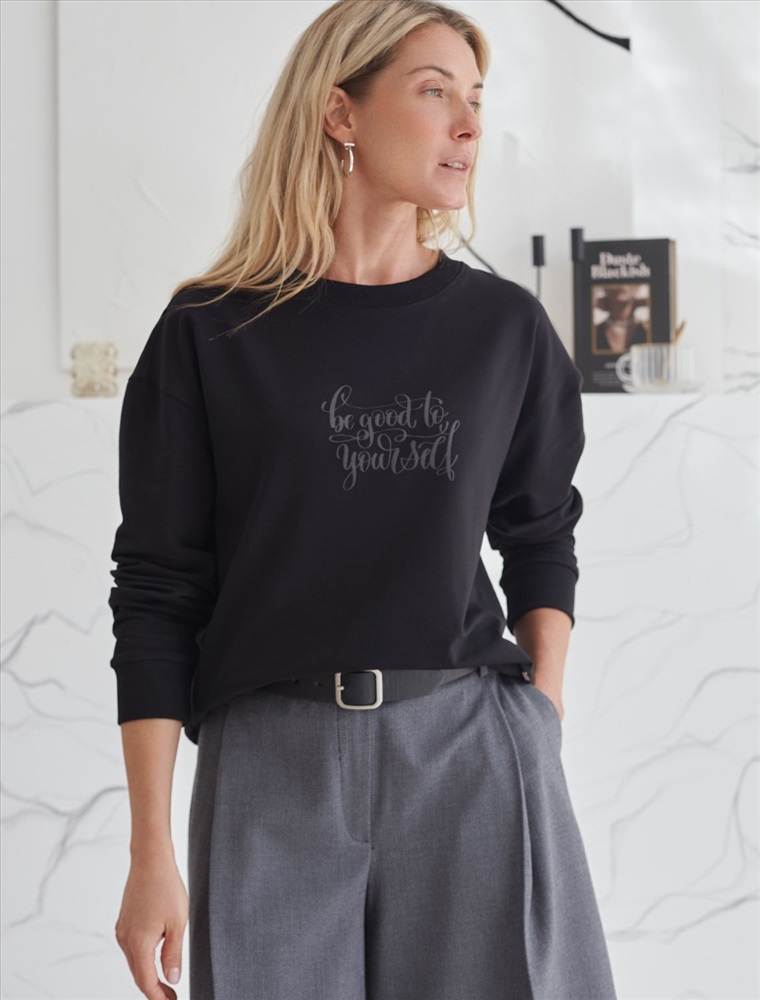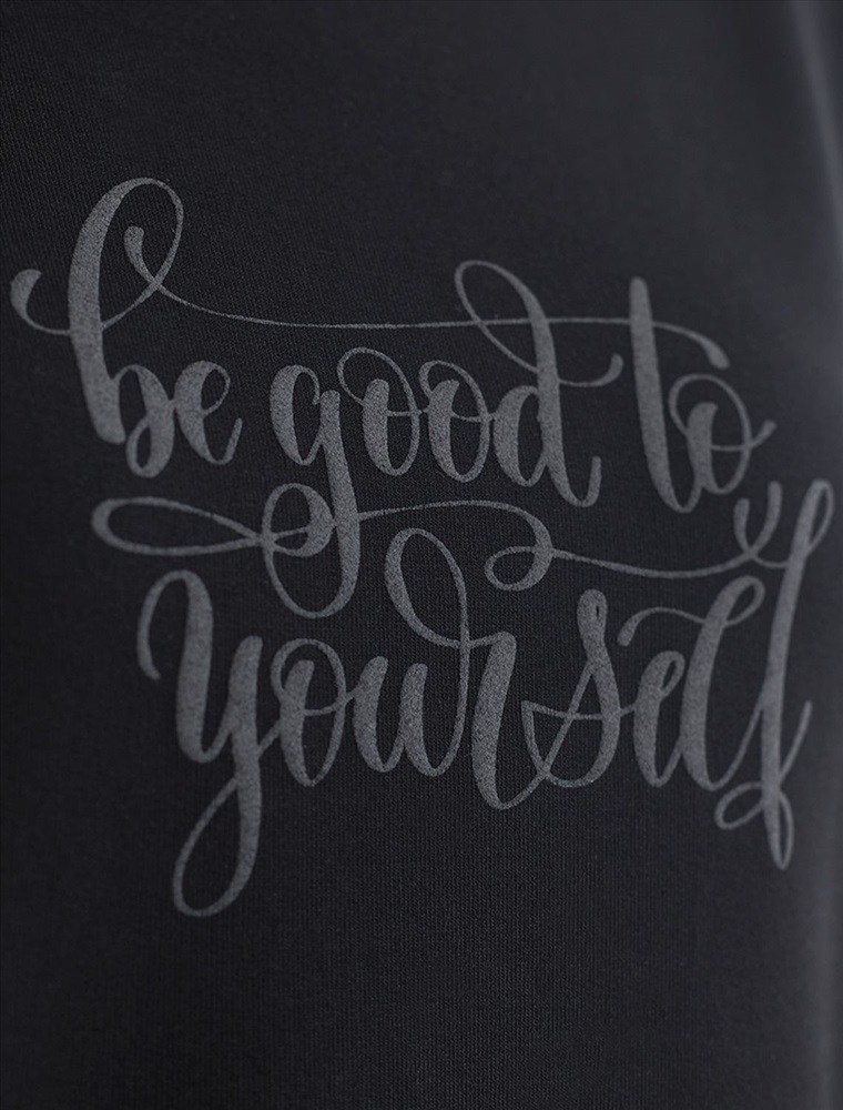 Плотность: 240 Г/м2 Стильный свитшот черного цвета из премиального футера двухнитки с эластаном сочетает в себе комфорт и оригинальность. Джемпер выполнен из натурального хлопка, который обеспечивает мягкость и дышащие свойства ткани. Нежный материал дарит ощущение уюта в любое время года, а премиальное качество изготовления гарантирует долговечность и сохранение формы после множества стирок. Особенность изделия — спущенная линия плеча и аккуратные разрезы, которые добавляют современный акцент и делают образ более выразительным. Принт в виде надписи придает индивидуальность, позволяя выделиться без лишней вычурности. Перевод надписи Be good Be yourself - Будь хорошей, будь собой. Дополнен металлическим логотипом бренда. Представлена широкая размерная линейка, включая маленькие и большие размеры, что позволяет подобрать идеальный вариант для разной фигуры и роста. Этот уютный свитшот отлично подходит для повседневной носки благодаря своей комфортной посадке и мягкой текстуре. Он станет универсальным элементом гардероба, легко сочетающимся с различными стилями одежды. Свободный джемпер из футера станет отличным выбором для повседневной носки и активного отдыха, обеспечивая стильный внешний вид и удобство в любое время года. Комментарии к товару