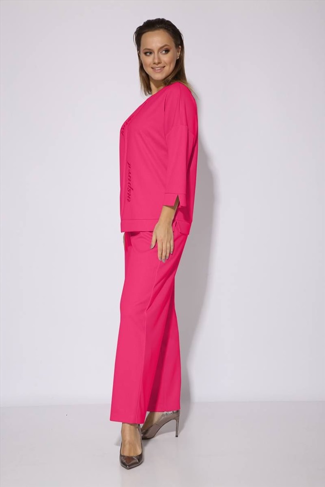 Комплект женский ,2х предметный, состоящий из джемпера и брюк. Джемпер прямого силуэта. Рукав со спущенной линией плеча, длиной 3/4. По низу рукава манжет с разрезом. По центру переда застрочен защип. По низу джемпера притачные планки, по бокам с разрезами. Перед задекорирован вышивкой с паетками в тон изделия Брюки длинные, широкие палаццо.