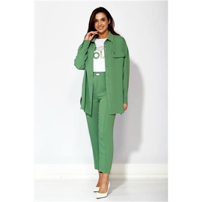 Комплект женский 3х предметный, состоящий из рубашки, брюк и футболки. Рубашка прямого силуэта с длинным рукавом. Рукав со спущенной линией плеча. По низу рукава манжета с застежкой на петлю и пуговицу. По переду рубашки кокетка с отлетными клапанами. Один клапан акцентирован пришивным декором. Застежка центральная с отрезной планкой на петли и пуговицы. Воротник рубашечный на стойке. Низ рубашки фигурной формы. По спинке отрезная кокетка. Брюки зауженные к низу. По бокам наклонные карманы. По переду застрочены защипы в виде "стрелок". Пояс широкий, притачной, частично с резинкой. Спереди, на поясе, декоративная нашивка. Футболка прямого силуэта с коротким втачным рукавом. Вырез горловины круглой формы с подрезной бейкой. Перед задекорирован вышивкой-аппликацией.