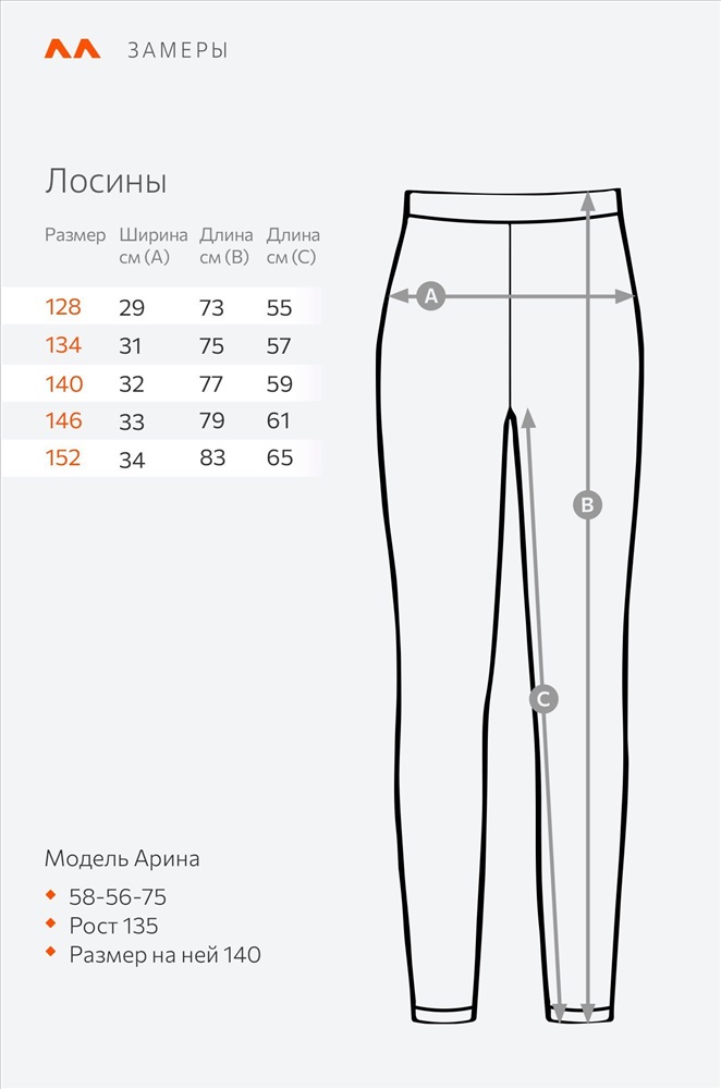 Размер 140: длина внешн.шва:77 см; длина внутр.шва:59 см; ширина по бедрам:32 см.