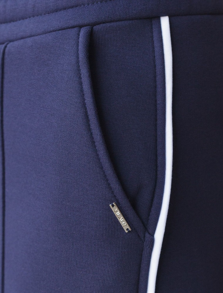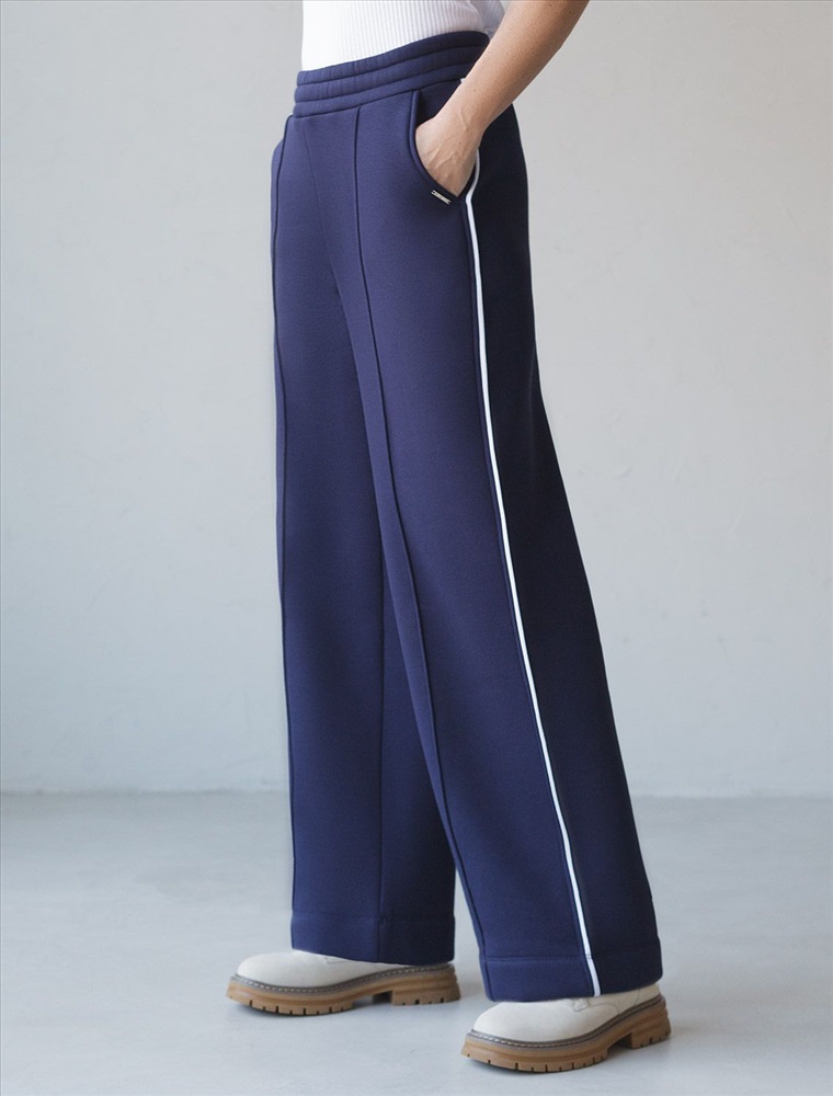 Теплые прямые брюки темно-синего цвета из эластичного футера трехнитки с начесом созданы для максимального комфорта в холодную погоду. Мягкий материал приятный к телу, хорошо держит форму, не вытягивается и не теряет форму даже при активной носке. Благодаря дышащим свойствам премиального футера, брюки подходят на любую погоду, обеспечивая оптимальный микроклимат и уют. Свободный крой и эластичный широкий пояс делает посадку удобной для разных типов фигуры и размеров, включая большие и маленькие. Застроченные стрелки визуально вытягиват силуэт и подчеркивают эстетичнось повседневных брюк, а контрастные тонкие лампасы добавляют актуальности образу. Благодаря особенностям трехниточного плетения и внутреннему слою с начесом, эти брюки отлично сохраняют тепло в холодные осенние и зимние дни, при этом в них вы будете выглядеть модно и современно. Вы можете составить комплект с артикулами: D49.143 и D49.142