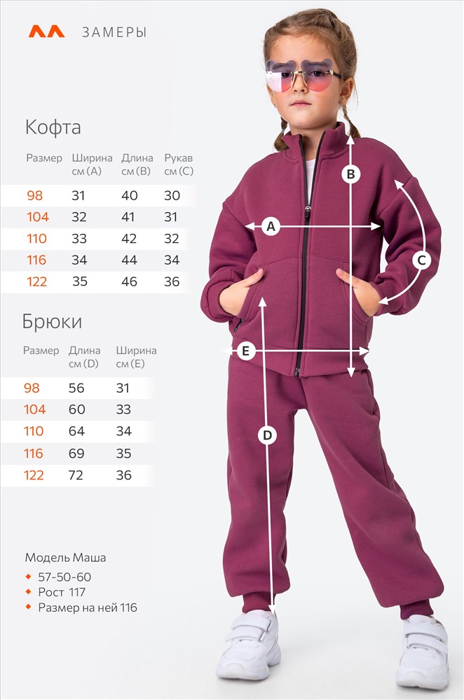 Размер 116: кофта: длина:44 см; ширина:34 см; длина рукава внешняя:47 см; длина рукава внутренняя:32 см.