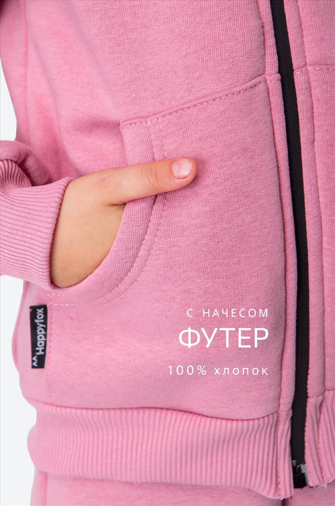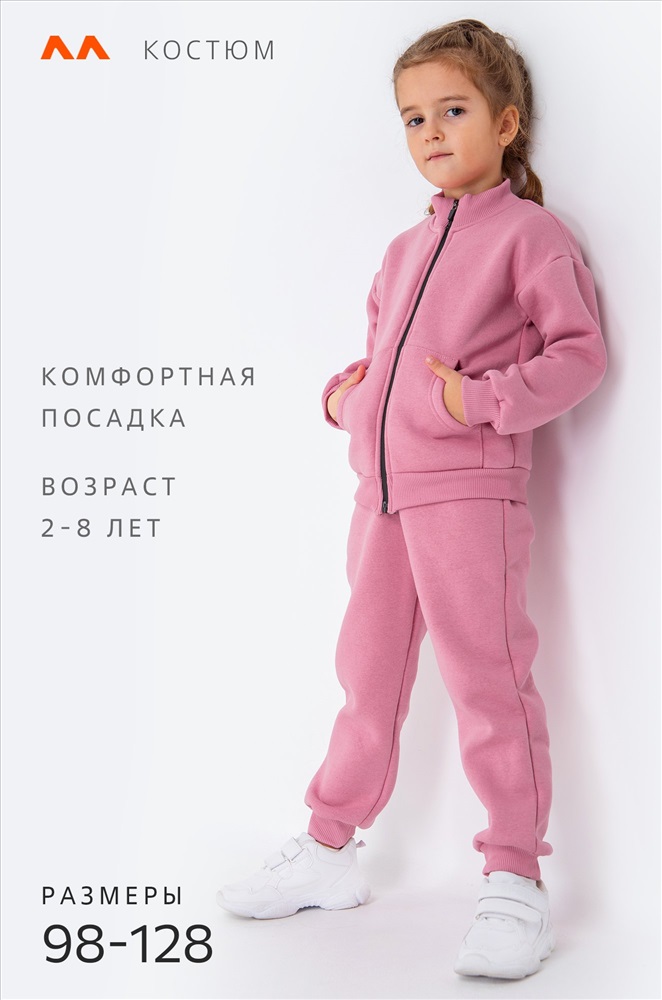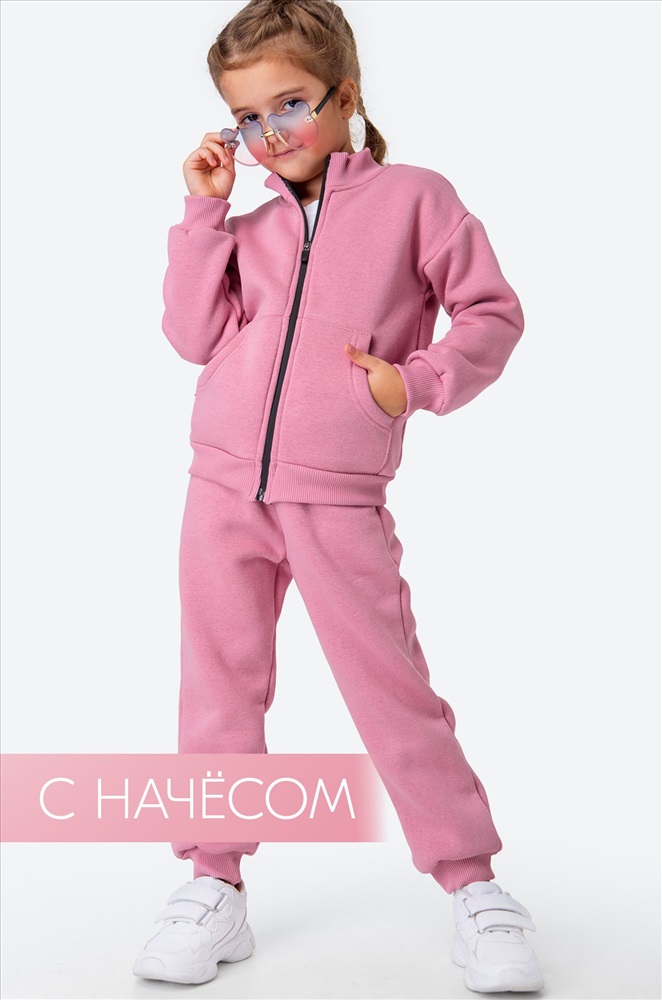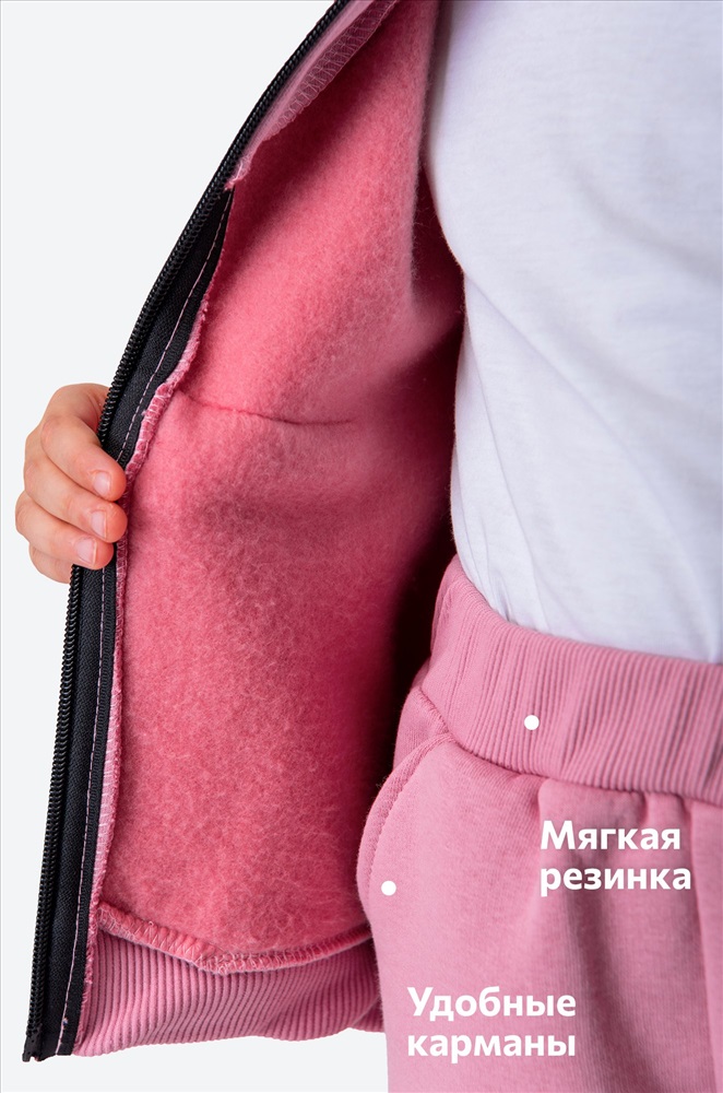 Розовый костюм для детей выполнен из натурального 100% хлопка, плотной трикотажной ткани. Начес отлично сохраняет тепло и не пропускает холодный воздух. Костюм хорошо тянется и держит форму даже после частых стирок.