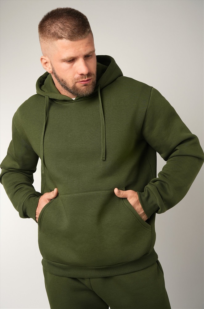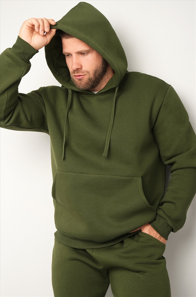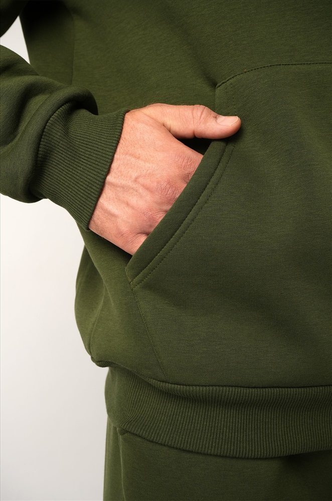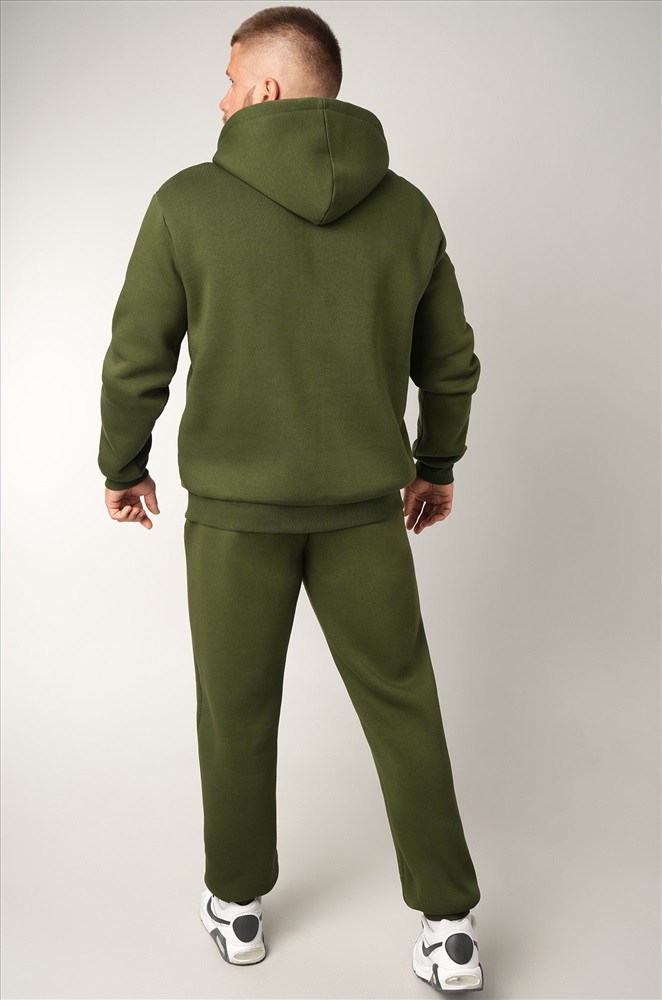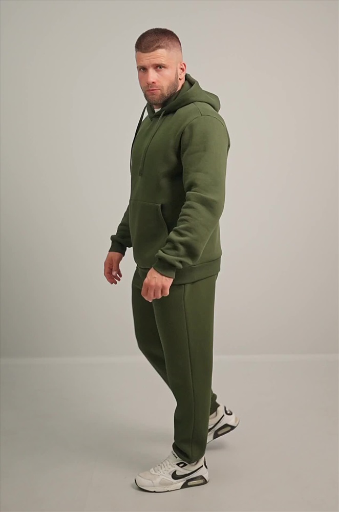 Преимущества: — утепленный спортивный костюм выполнен из хлопкового трикотажа футер с начесом (320 г/м2); — демисезонный костюм цвета хаки хорошо сохраняет тепло осенью, весной и зимой; — капюшон регулируется шнурком и защищает от ветра; — удобный карман кенгуру делает модель практичной; — по бокам имеются карманы, пояс на шнурке обеспечивает удобство; — благодаря манжетам штанины и рукава не задираются; — хлопковый спортивный костюм с добавлением полиэстера не теряет форму и цвет после стирок; — однотонный зеленый костюм со штанами универсален; Трикотажный костюм для мужчин идеально подходит для осенних и весенних прогулок. Костюм станет стильной основой для многослойного зимнего образа. Рост модели 172, параметры: объем груди 111, объем талии 87, объем бедер 98. На нем размер 52.