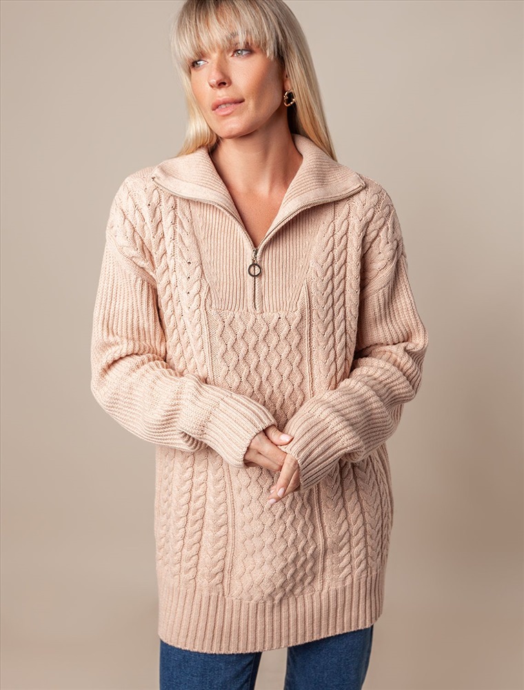 Свитер выполнен из хлопковой пряжи узором косы. Добавление акрила в состав, способствует непревзойденному теплу, мягкости и долговечности изделия. Модель дополнена декоративной вставкой спереди и высоким воротником на золотистой молнии. Теплая и очень уютная модель, хорошо сочетается с брюками из эко-кожи и джинсами.