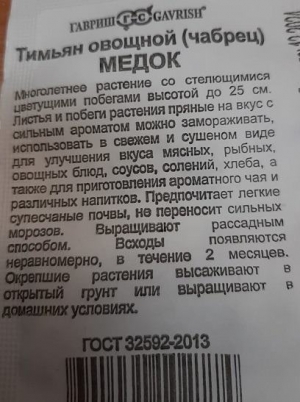Многолетнее пряное и лекарственное растение. Содержит эфирное масло, минеральные соли (Mg, K, Ca), аскорбиновую кислоту, флавоноиды. Вегетационный период от полных всходов до последнего сбора 150 дней. Имеет стелющиеся цветущие, хорошо облиственные побеги. Листья мелкие, продолговато-яйцевидные, сверху темно-зеленые, снизу – серовато-фиолетовые. Цветки светло-розовые, собраны на концах ветвей в головчатые соцветия. Урожайность зеленой массы с одного растения 50 г. Предпочитает легкие супесчаные почвы. Листья и побеги используют в свежем и сушеном виде в качестве пряной зелени к различным блюдам, соусам, для засолки овощей, приготовления напитков. Обладает сильным антисептическим и дезинфицирующим свойствами. Входит в состав грудных сборов, используется в народной медицине для укрепления памяти. Фасовка 0,25г Комментарии к товару