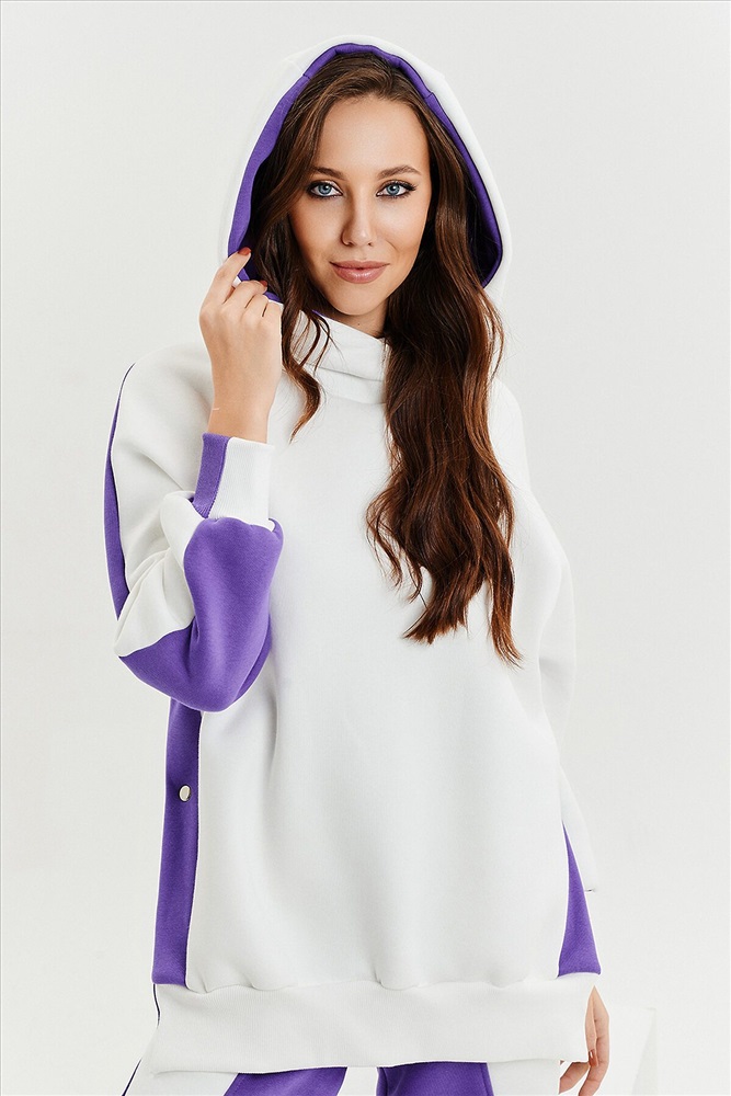 ID товара: 822067 Состав: Хлопок 70%, Полиэстер 30% Сезон: Осень/Зима Длина: Удлиненная Фасон: Свободный крой Рукав: Длинные Вырез горловины: Капюшон Декоративные элементы: Кнопки Основная ткань: Хлопок | Футер 3-х нитка с начесом Стиль: Спортивный Страна бренда: Россия Страна производства: Россия Худи oversize женское. Материал - футер с начёсом. Худи выполнено в технике Color Block (цветовые блоки). Модель свободного покроя, с большим, уютным капюшоном. Силуэт - трапециевидный, изделие заужено к низу. Рукав - реглан. Манжета на резинке-кашкорсе со швом, из двух цветов. Нижний пояс также изготовлен из кашкорсе, нет стягивающего эффекта. По бокам - планки на застёжке-кнопке, разного цвета. Комментарии к товару