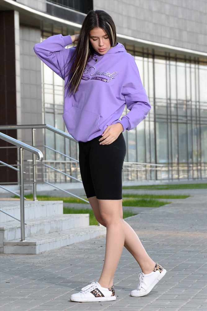 Состав материала: хлопок 72%, полиэстер 20%, лайкра 8% Вид изделия: Толстовки Для: Женщин Бренд: Натали Код товара: НФ-00062043 Фиолетовая мода. Слегка удлинённая толстовка в спортивном стиле с карманом кенгуру и капюшоном. Изделие выполнено из футера без начёса. Перевод текста:"Будь самим собой и не важно что о тебе говорят." Линия плеча спущена, рукава удлинённые. В измерениях длина рукава указана от шва втачивания капюшона. Манжеты и низ толстовки обработаны плотной резинкой кашкорсе. Комментарии к товару