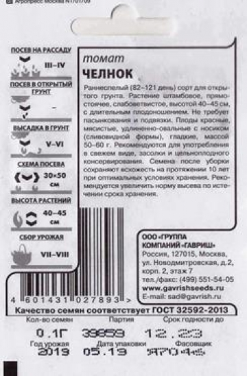 Растение штамбовое, прямостоячее, слабоветвистое, высотой 40-45 см. Плодоношение растянутое. Для открытого грунта. Не требует пасынкования и подвязки. Ультраскороспелый: созревание плодов наступает на 82-121 день после появления всходов. Плоды красные, мясистые, удлиненно-овальные с носиком (сливовидной формы), гладкие, массой 50-60. Рекомендуется для садово-огородных участков, приусадебных и мелких фермерских хозяйств; для употребления в свежем виде, засолки и цельноплодного консервирования. Фасовка 0,1г Комментарии к товару