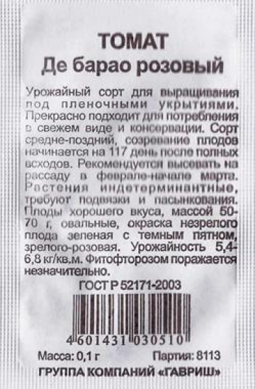 Среднеспелый (115-120 дней от всходов до плодоношения) высокорослый сорт для пленочных и остекленных теплиц или для выращивания в открытом грунте (в более южных регионах). Растение сильноветвистое, сильнооблиственное, высотой более 2 м. Требует подвязки и пасынкования. Первое соцветие закладывается над 9-11 листом, последующие - через 3 листа. Плод овальный, гладкий, окраска незрелого плода зеленая, с темным пятном, зрелого — желтая. Масса плода 80-83 г. Вкус хороший. Товарная урожайность 6,2-6,4 кг/кв.м. Слабо поражается фитофторозом. Ценится за высокую урожайность, хорошие вкусовые и технологические качества плодов. Рекомендован для употребления в свежем виде и цельноплодного консервирования.