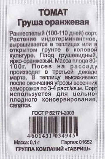 Среднеспелый (от всходов до созревания 110-115 дней) высокорослый сорт для выращивания в пленочных и остекленных теплицах, а также в открытом грунте (с подвязкой к кольям). Растение индетерминантное (с неограниченным ростом). Плоды грушевидной формы, оранжевые, гладкие, плотные, массой 50-80 г, с прекрасным вкусом. Сорт ценится за высокую урожайность, аппетитных, декоративных плодов. Рекомендуется для употребления в свежем виде и консервирования. Посев на рассаду — в конце февраля – начале марта. Пикировка — в фазе первого настоящего листа. Высадка рассады в теплицы — в конце апреля — начале мая. Обязательна подвязка растений через несколько дней после высадки. Формируют в один стебель, удаляя все «пасынки» и нижние листья, а также прищипывают точку роста в конце вегетации. Схема посадки: 40х60 см. Фасовка 0,1г Комментарии к товару