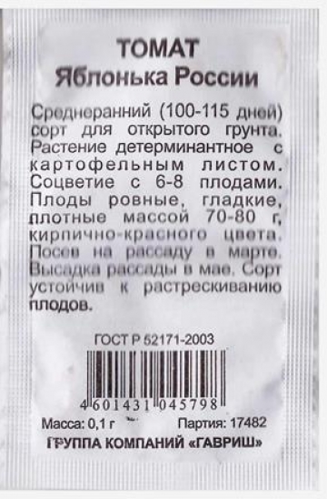 Скороспелый (75-100 дней от всходов до плодоношения) популярный сорт для выращивания в открытом грунте и под временными пленочными укрытиями. Растение среднерослое, компактное, штамбовое. Плод округлый, гладкий, плотный, красный, массой 90 г. Рекомендуется для употребления в свежем виде и цельноплодного консервирования. Отличается дружным созреванием плодов. Посев на рассаду производят в конце марта — начале апреля. Пикировку— в фазе первого настоящего листа. Высадку рассады в открытый грунт - в мае. Схема посадки: 40х50 см. Фасовка 0,1г Комментарии к товару