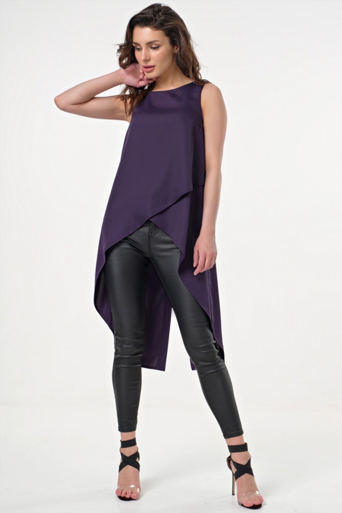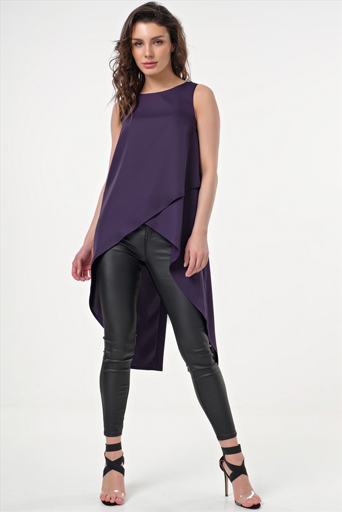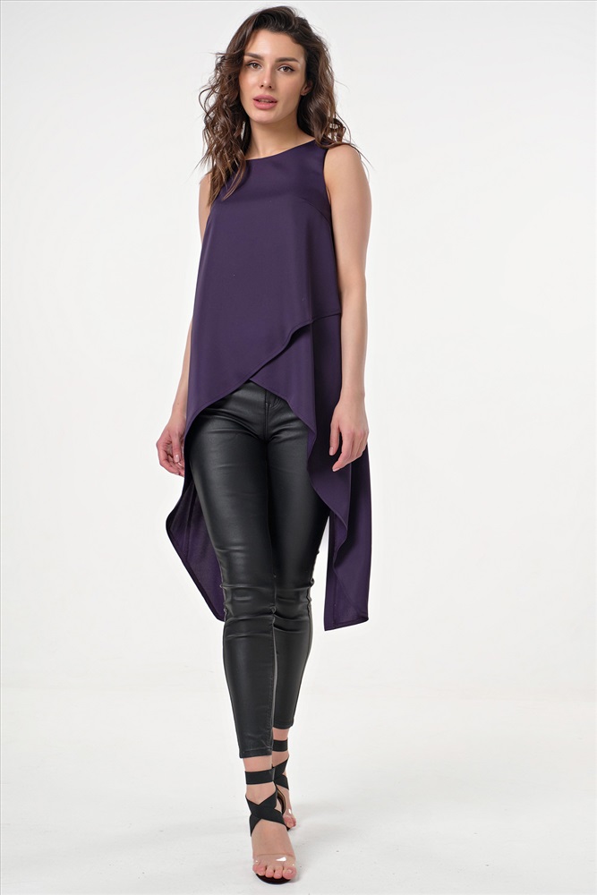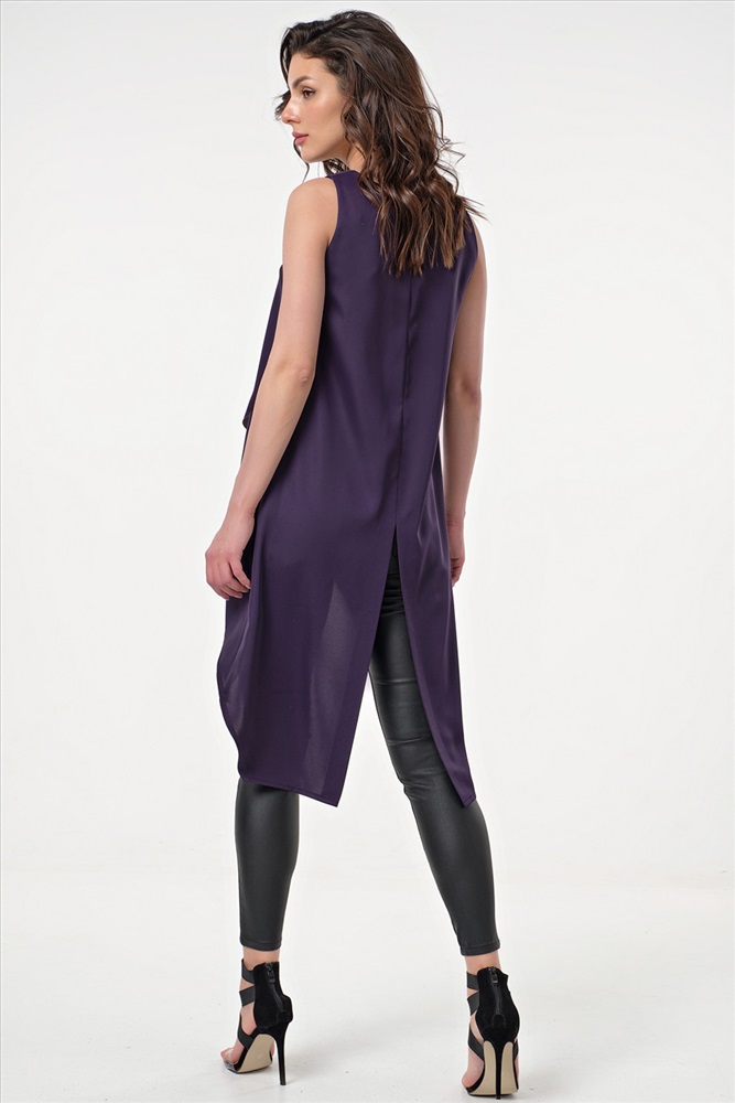 Состав: полиэстер 100% Цвет: фиолетовый • Тип горловины: округлый • Длина рукава: без рукавов • Линия плеча: на естественном месте • Длина изделия: 102 см • Силуэт: прямой • Застежка: нет • Особенности: Топ из струящейся ткани асимметричного кроя. По переду выполнен запах. Спинка с удлинением и разрезом. Комментарии к товару