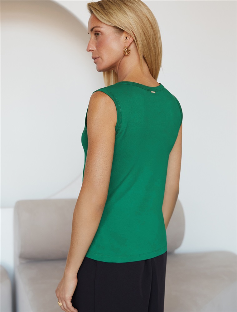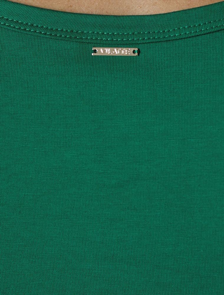 Топ выполнен из премиального хлопка с эластаном. V- вырез подчеркивает линию декольте и визуально вытягивает шею. Лаконичная базовая модель впишется в любой гардероб и дополнит многослойные образы. Материал изделия хорошо тянется и гарантирует идеальную посадку по фигуре. Из украшений только металлическим логотипом бренда.