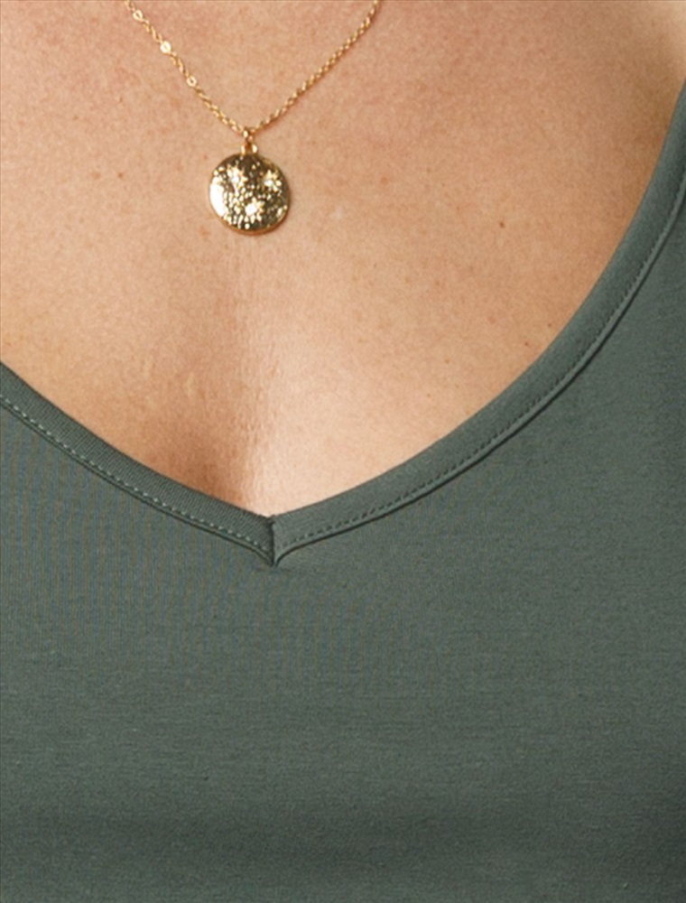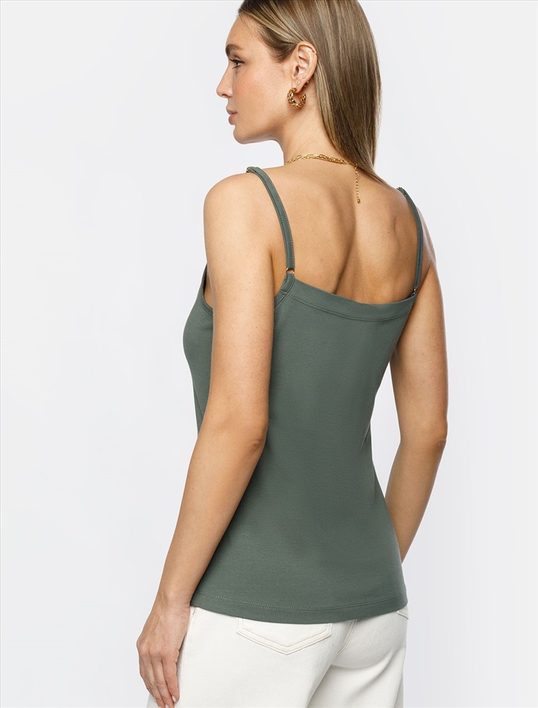 Топ с V-вырезом выполнен из премиального хлопка. Модель дополнена регулируемыми бретелями, позволяющими носить изделие на нужном уровне. Эластичный материал гарантирует комфорт и формоустойчивость. Из украшений металлический логотип бренда.