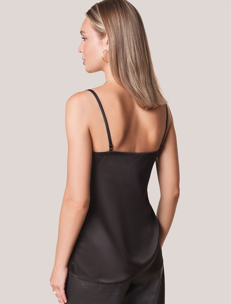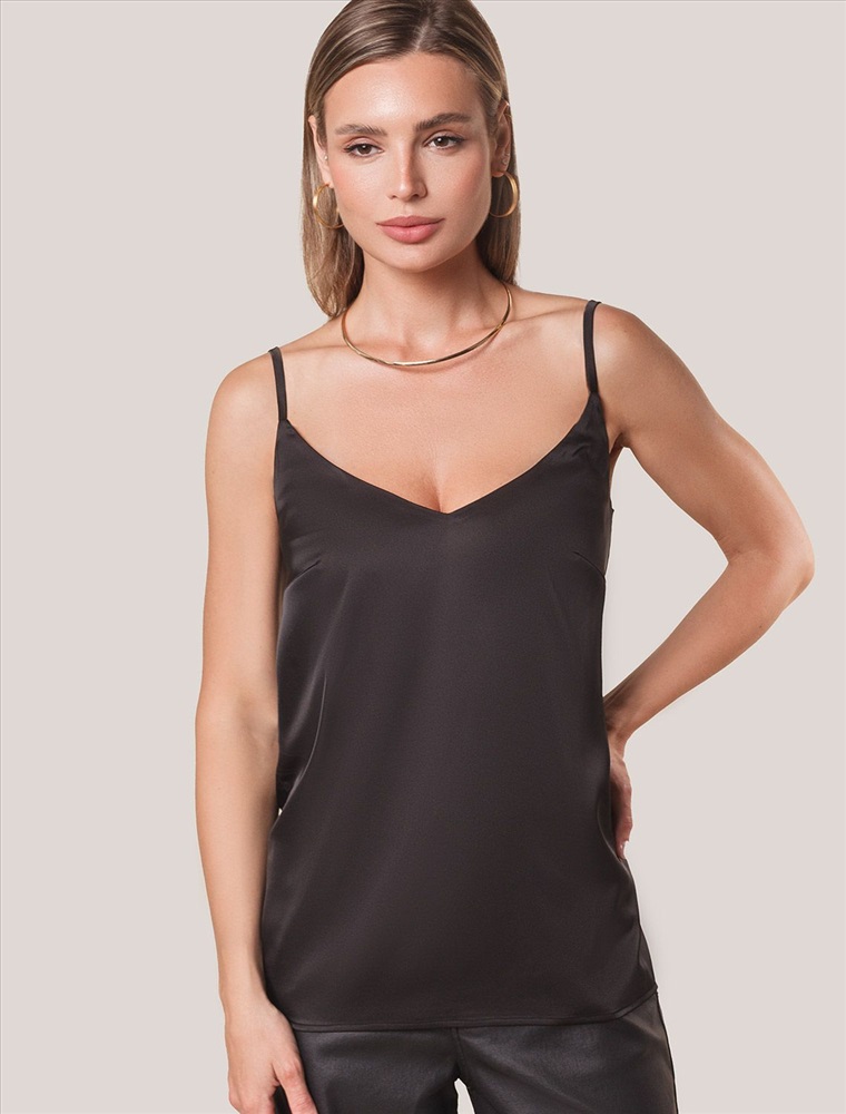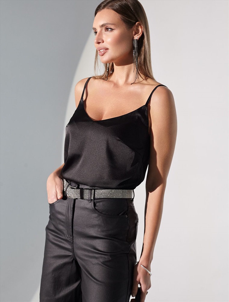 Плотность: 107 Г/м2 Параметры модели на первом фото: Рост 170, бюст 89, талия 63, бедра 92 Размер товара на первом фото: 42 Элегантный топ в черном цвете с регулируемыми лямками выполнен из сатиновой ткани премиального качества, сочетающей полиэстер и эластан в составе. Этот уникальный дуэт материалов обеспечивает комфортную посадку топа. Универсальный крой делает топ идеальным базовым элементом как для повседневных образов с джинсами или юбкой, так и для вечерних луков под жакет или кардиган. Комментарии к товару
