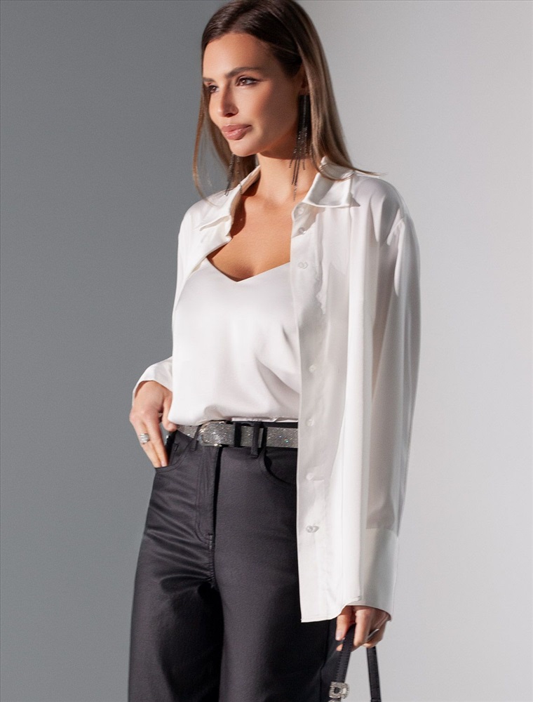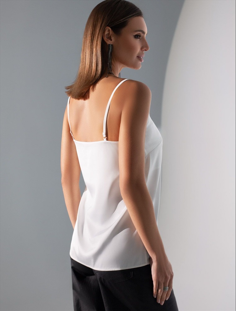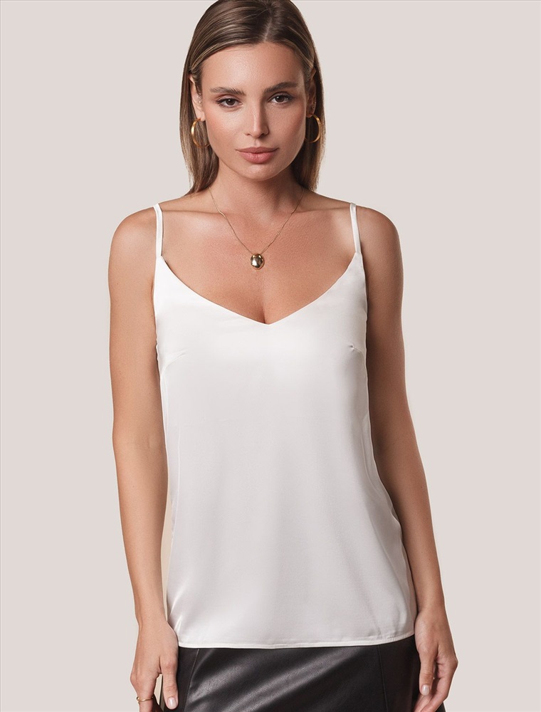Элегантный топ натурального белого цвета с регулируемыми лямками выполнен из сатиновой ткани премиального качества, сочетающей полиэстер и эластан в составе. Этот уникальный дуэт материалов обеспечивает комфортную посадку топа. Универсальный крой делает топ идеальным базовым элементом как для повседневных образов с джинсами или юбкой, так и для вечерних луков под жакет или кардиган.