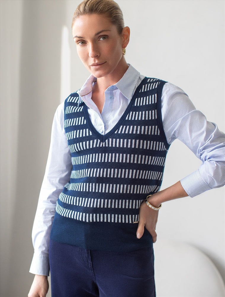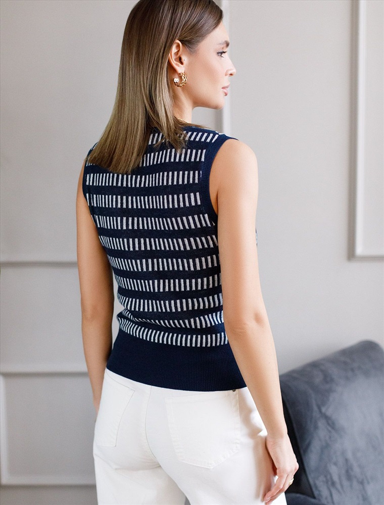 Плотность: 255 GG Топ из тонкого жаккарда выполнен из вискозы. Вертикальный вывязанный принт визуально стройнит и вытягивает силуэт. Добавление в состав ПЭ способствует легкости и износостойкости изделия. Мягкая пряжа приятно ощущается на теле и дарит настоящий комфорт в теплое время года. Можно стилизовать изделие в многослойных образах как жилет. Комментарии к товару