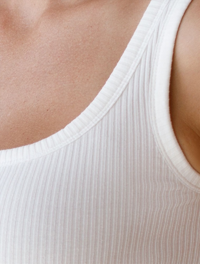 Топ выполнен из трикотажа в широкий рубчик. Эластичный хлопковый трикотаж идеально сидит по фигуре, не сковывает движений и очень комфортный в носке. Фактура вертикальных полос визуально стройнит и вытягивает силуэт. Базовое изделие хорошо впишется в любой гардероб. Идеально подходит для многослойных образов в базовый гардероб.