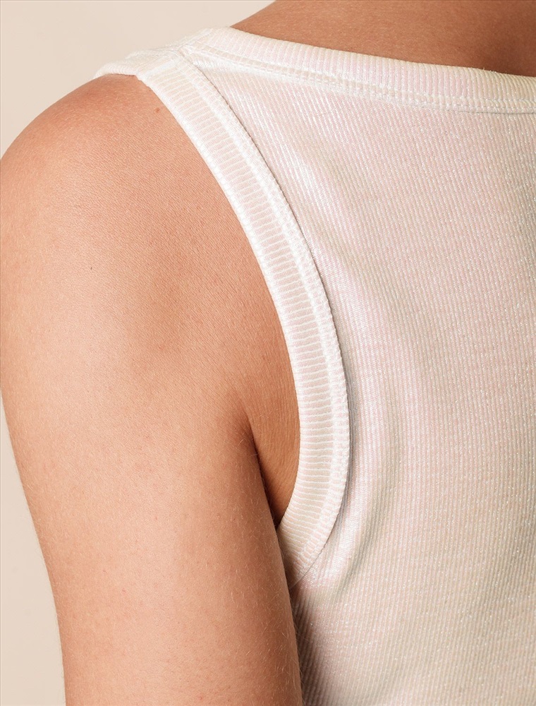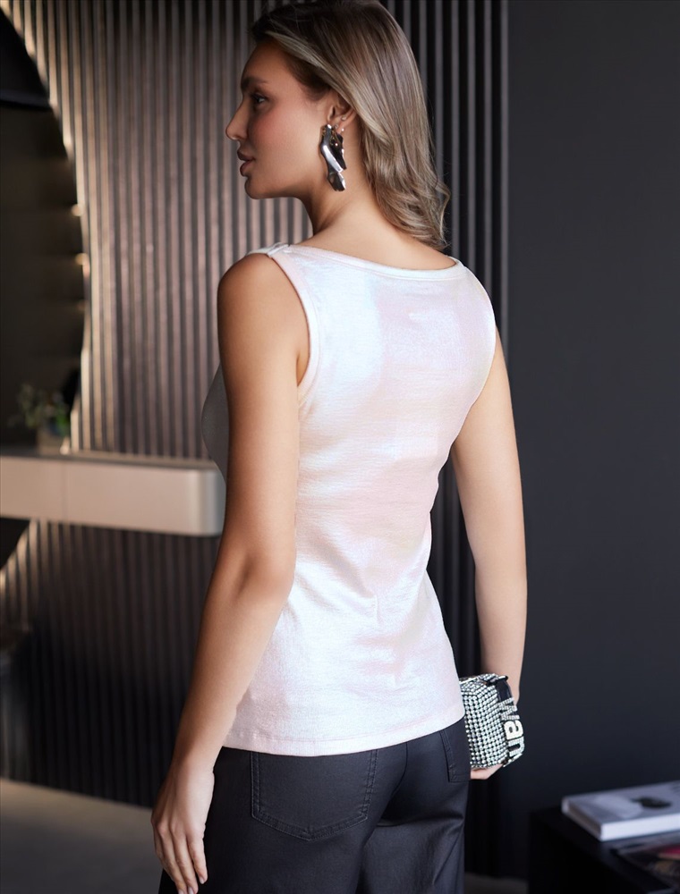 Эффектный топ перламутрового цвета с широкими лямками — идеальный выбор для создания стильного образа на каждый день или вечерний выход. Ткань в мелкий рубчик визуально вытягивает силуэт, правильный крой подходит на любую фигуру, комфортно садится на большие размеры, не сковывая движений. Изысканный матовый блеск металлик добавляет современный акцент даже самому простому образу.