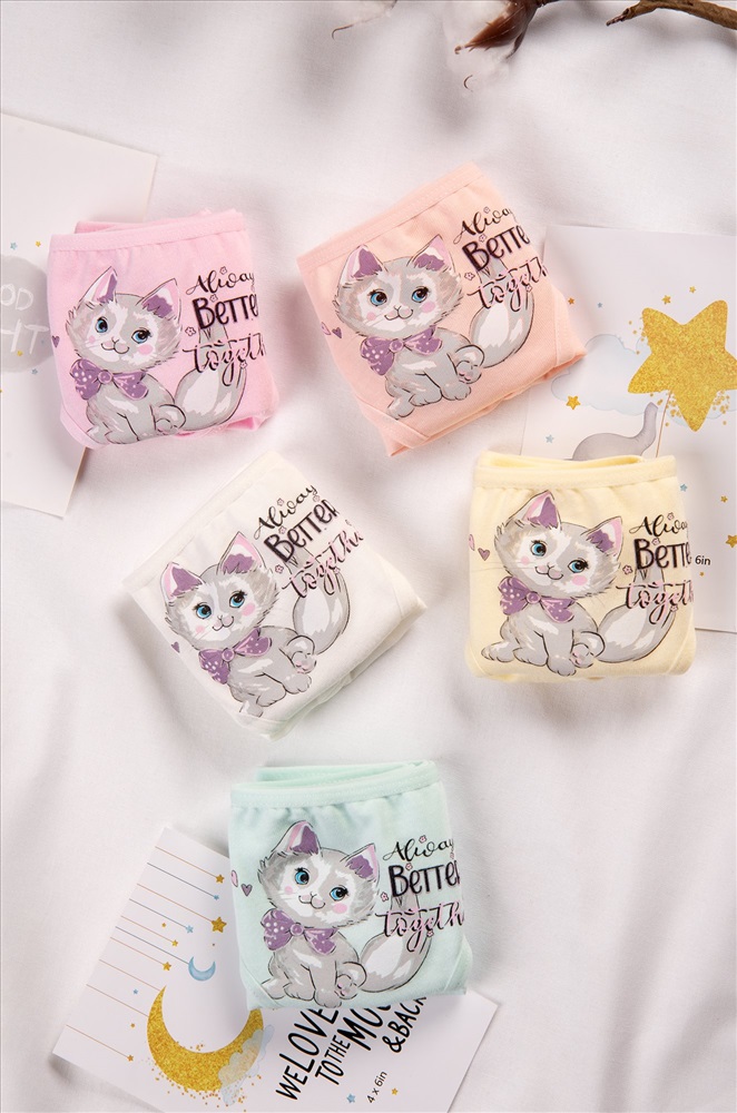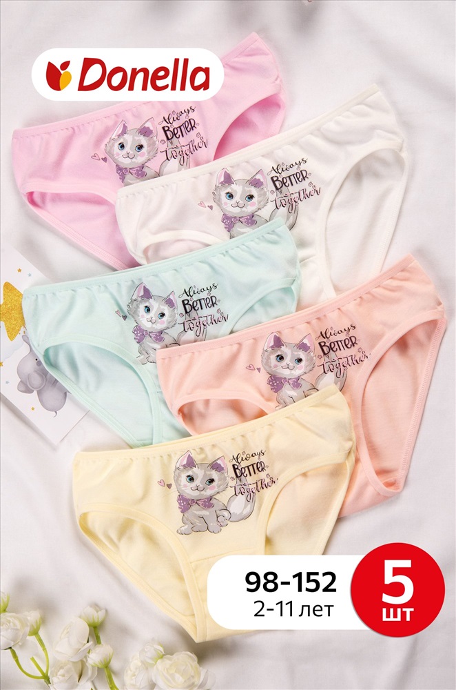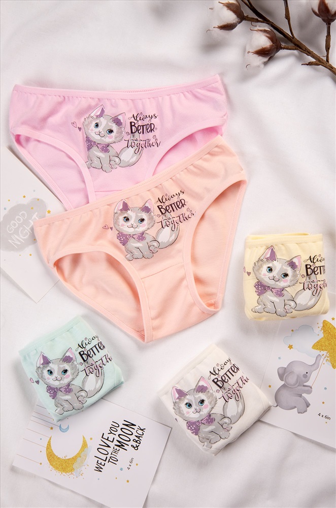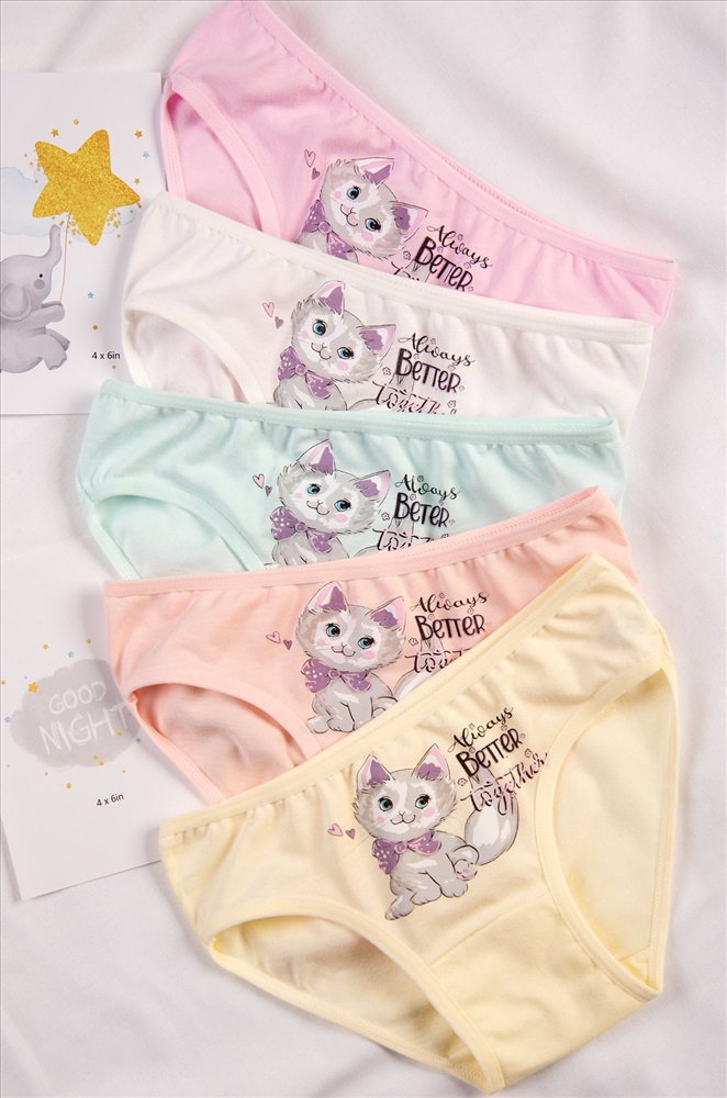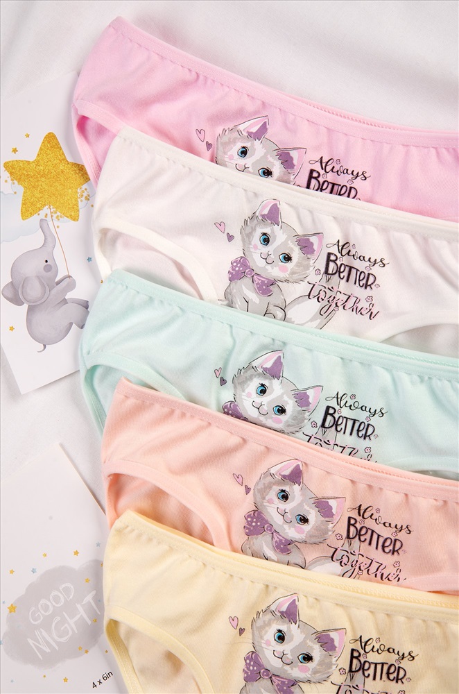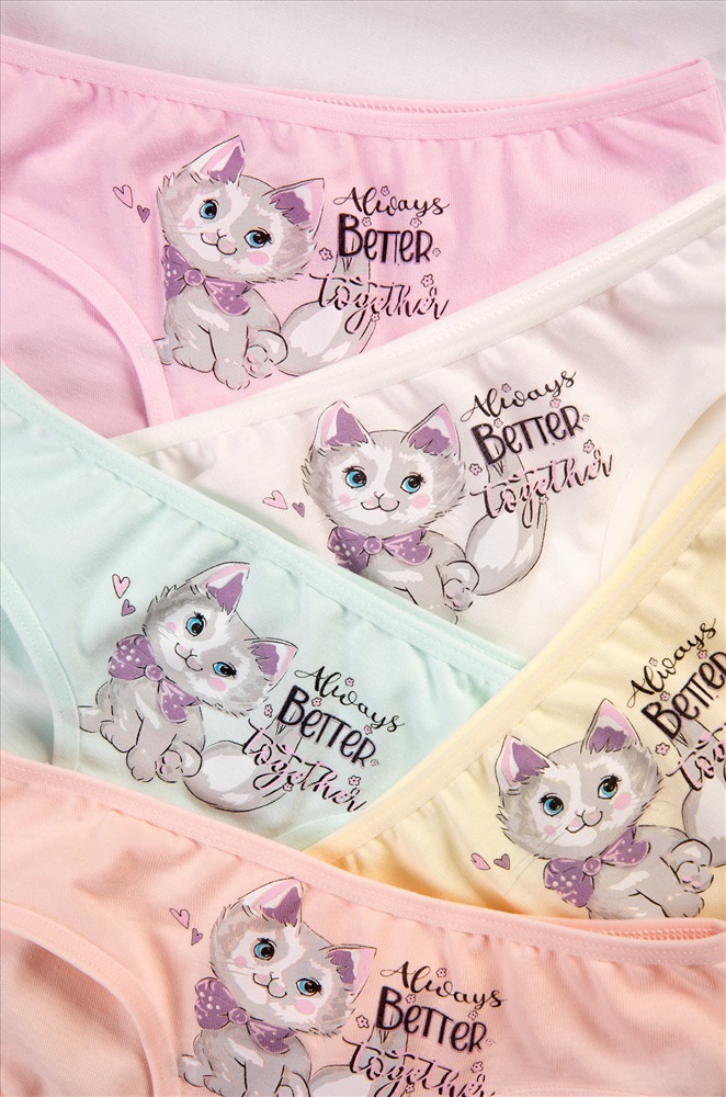 Уверенность в каждом движении! Набор детских трусов слипов 5 штук для девочек выполнен из мягкого хлопка, который позволяет коже дышать. Трусики для детей представлены в нежных пастельных цветах и украшены милым рисунком котик и надписями.