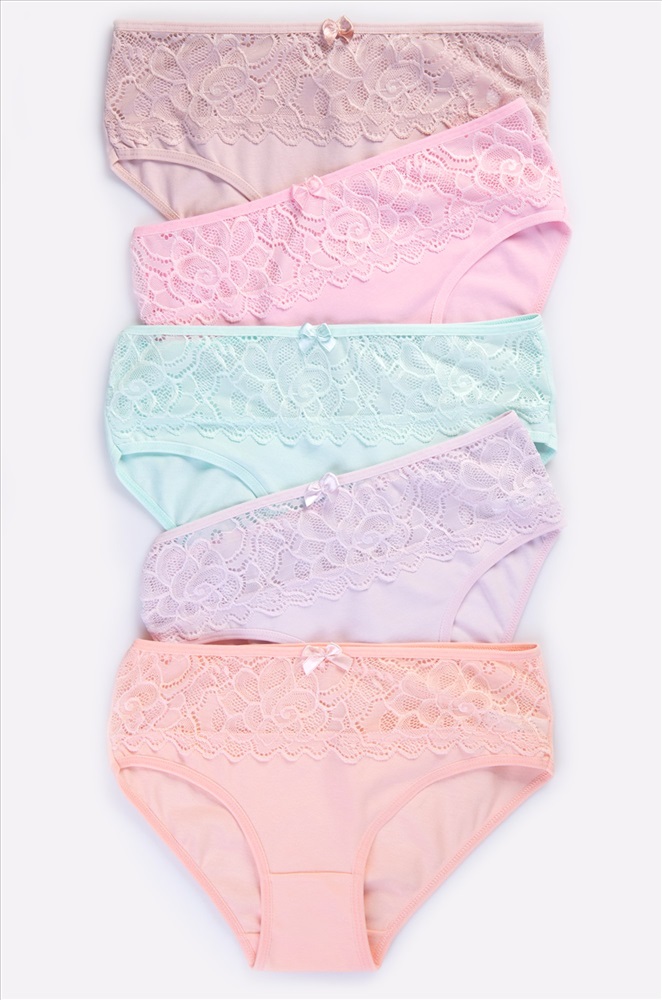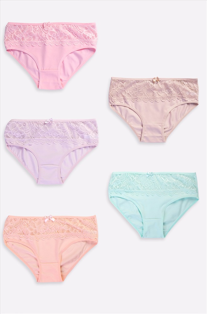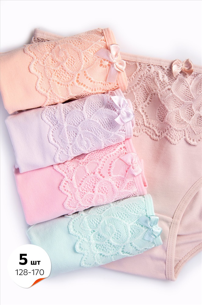 Набор детских трусов слипов 5 штук для девочек и девочек-подростков выполнен из приятного к телу хлопка. Трусики-слипы отлично тянутся и аккуратно сидят на теле. Трусы для детей представлены в пастельной цветовой гамме. Слипы понравятся каждой девочке благодаря изящным кружевной вставке и милому атласному бантику.