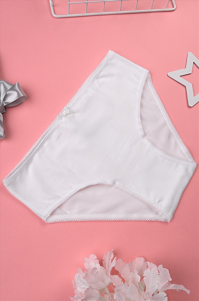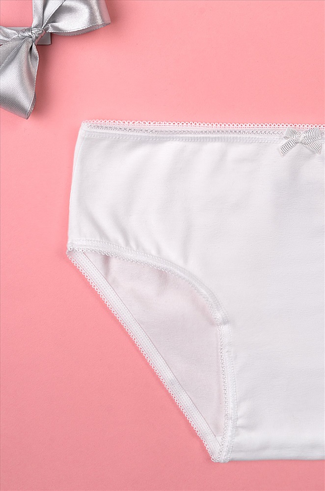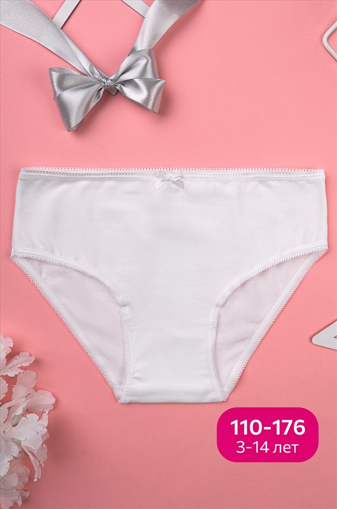 Классические белые трусики слипы для девочек и подростков выполнены из качественного хлопкового трикотажа. Детские трусы украшены ажурной бейкой в проймах и поясе и декорированы маленьким бантиком.