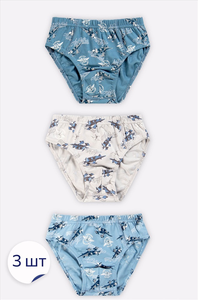 Трусы детские для мальчика украшены принтом Самолеты. Набор трусов для мальчика включает 3 шт. трусов разного цвета. Натуральный хлопок позволяет коже дышать. Добавление эластана способствует лучшей прочности. Все швы гладкие и аккуратные, не будут натирать. В поясе эластичная резинка.