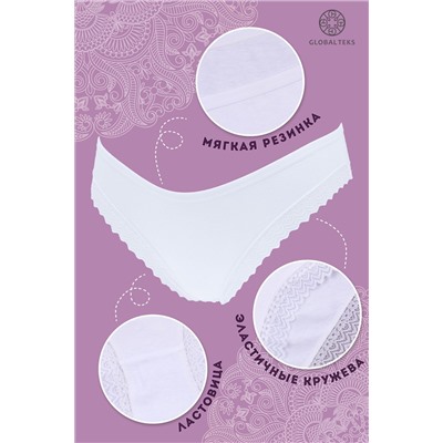 Трусы женские выполнены из 95% хлопка и 5% спандекса. В упаковке 2 штуки одного цвета и размера на выбор. Эластичные и мягкие кружева, универсальные расцветки. Ластовица в цвет изделия, мягкая и комфортная резинка. Производство Китай.