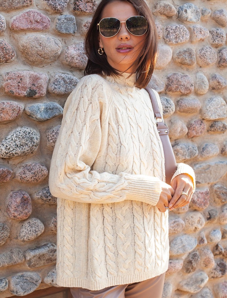 Свитер тонкой вязки с фактурным плетением косы. Теплая модель с воротником стойка выполнена из полушерстяной пряжи с добавлением кашемира. Соединение нитей нескольких цветов создает уникальный меланжевый эффект. Акрил в составе изделия, способствует формоустойчивости. Мягкая пряжа не вытягивается со временем и при этом отлично согревает в холодное время года. Свободный силуэт поможет создать уютные образы в расслабленном стиле