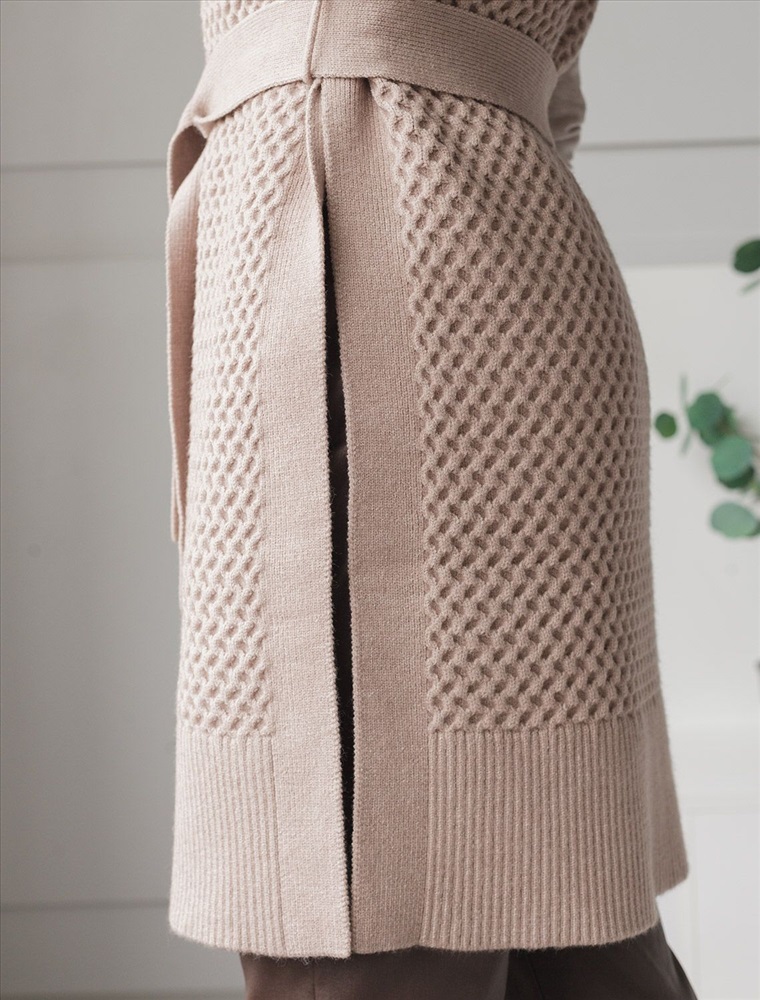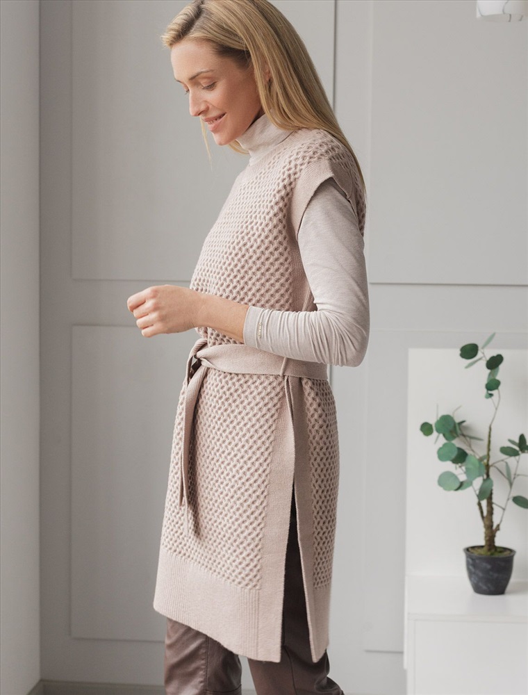 Удлиненный жилет выполнен из мягкой пряжи с кашемиром. Модель фактурной вязки дополнена высокими боковыми разрезами и поясом в тон изделия. Хорошо сочетается водолазками, лонгсливами и блузками. Мягкая пряжа очень приятная к телу, поддержит комфорт на протяжении всего дня, при этом не перегревая. Сочетается в костюме с брюками D38.013, D38.012 и юбкой D36.016