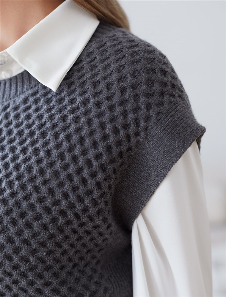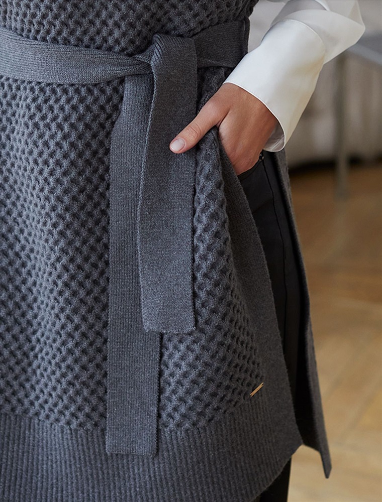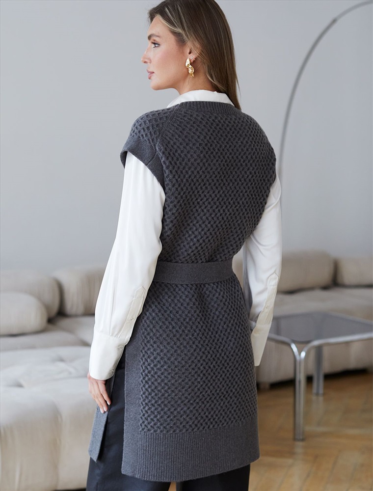 Размер товара на первом фото: 42 Удлиненный жилет выполнен из мягкой пряжи с кашемиром. Модель фактурной вязки дополнена высокими боковыми разрезами и поясом в тон изделия. Хорошо сочетается водолазками, лонгсливами и блузками. Мягкая пряжа очень приятная к телу, поддержит комфорт на протяжении всего дня, при этом не перегревая. Сочетается в костюме с брюками D38.013, D38.012 и юбкой D36.016