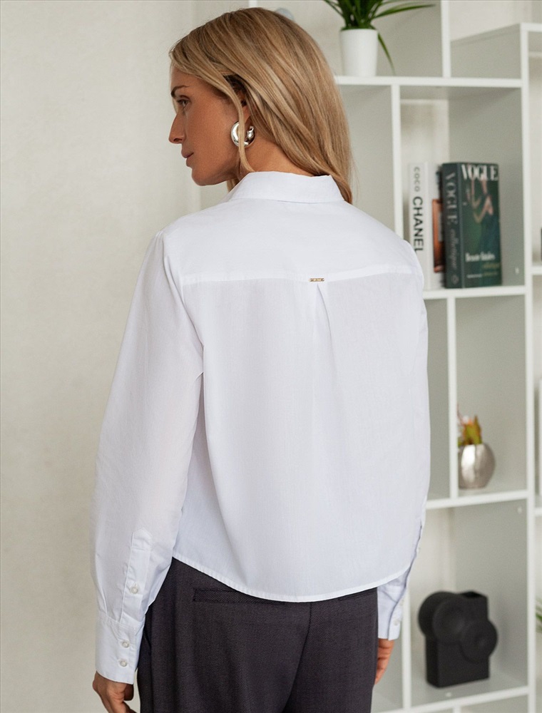 Укороченная блузка выполнена из хлопка. Лаконичная модель дополнена карманом. Изделие хорошо держит форму, что позволяет создать стильные строгие образы в офис. Чтобы подчеркнуть линию талии не теряя пропорций, сочетайте в комплекте с прямыми и широкими брюками. В более расслабленном образе – с джинсами трубами.