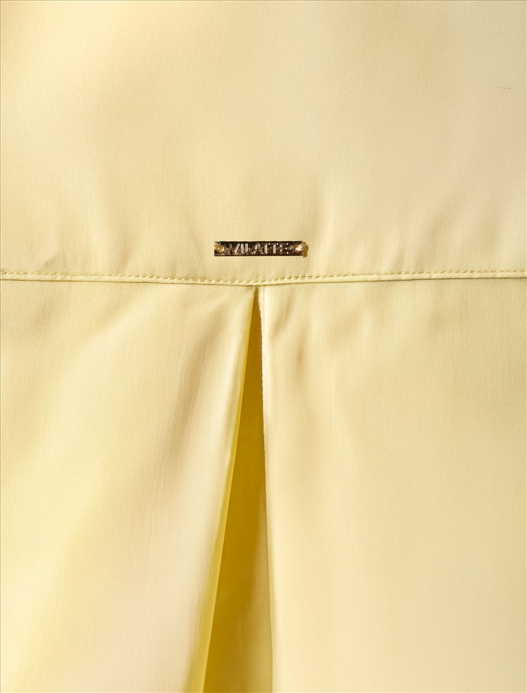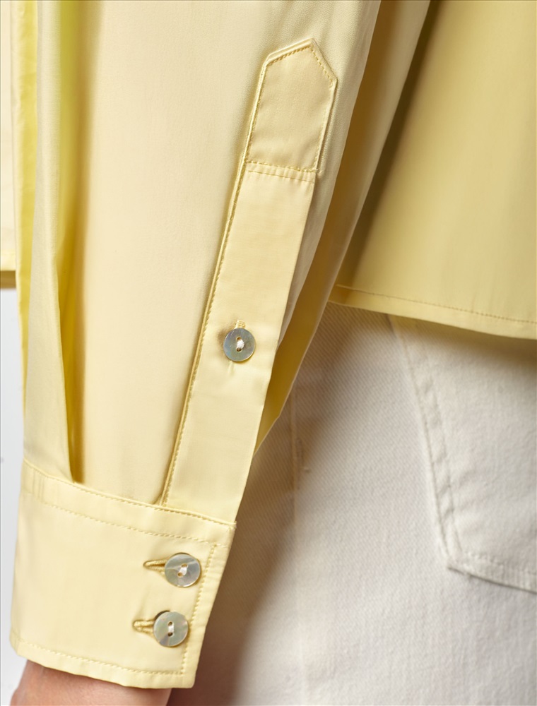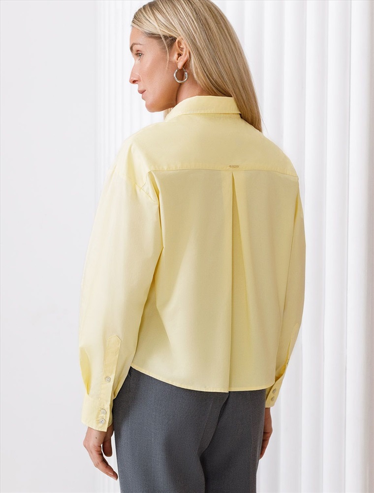 Параметры модели на первом фото: Рост 168, бюст 82, талия 60, бедра 90 Блузка в банановом оттенке выполнена из 100% поплина. Укороченная модель с застежкой планкой – идеальное решение для лаконичного образа. Будет одинаково хорошо смотреться с широкими брюками, свободными джинсами, пышной юбкой или кюлотами. Комментарии к товару