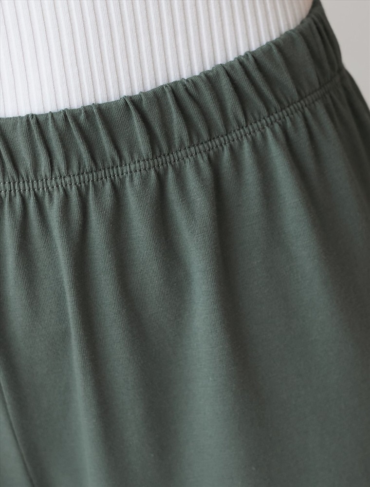 Укороченные брюки темно-оливкого цвета из мягкого эластичного хлопка подарят вам комфорт в любое время дня. Прямой крой обеспечивает свободу движений и удобство при носке. Материал приятен на ощупь, хорошо пропускает воздух и позволяет коже дышать, делая эти брюки идеальным выбором для повседневной носки.