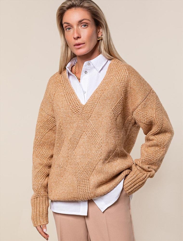 Уютный узорно-вязаный джемпер выполнен из меланжевой пряжи с ангорой и легким пушистым мохером, поэтому модель получилась особенно приятной на ощупь и при этом отлично согревает, не перегревая тело. При желании комфортно носить даже на голое тело, так как изделие мягкое и совсем не колется.