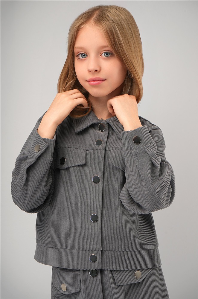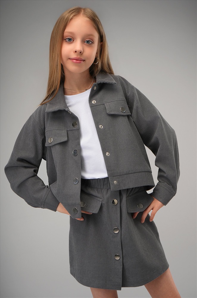 Детский вельветовый костюм двойка сочетает элегантность и комфорт. Серый костюм с юбкой для девочки и девочки подростка дополнит школьные образы.