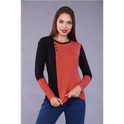 Лонгслив женский прилегающего силуэта комбинированный из ткани"лапша" двух цветов. По шву стачивания полочки - декоративные пуговки. Круглый вырез горловины обработан узкой планкой.